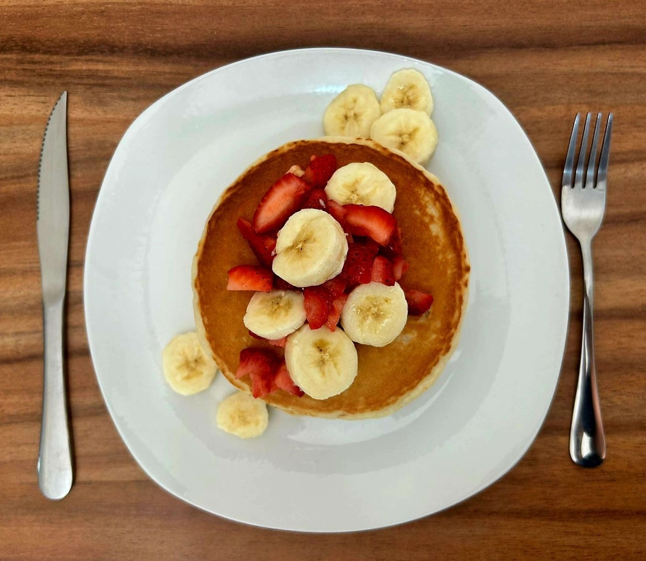 Disfruta unos hotcakes con hasta dos frutas de tu elección.
