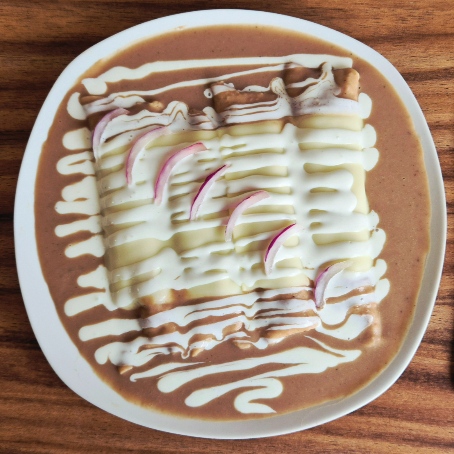 Orden de 4 enfrijoladas con cebolla, crema y queso gratinado.