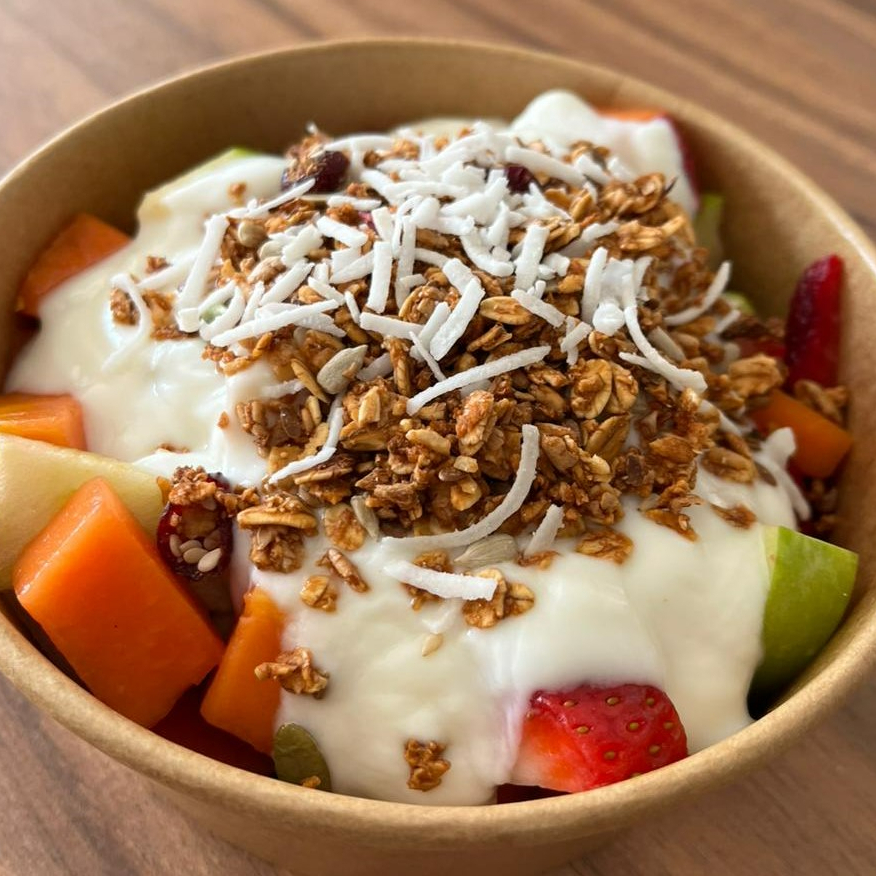 Mezcla de frutas, plátanos, fresas, manzanas, peras, etc, que te brindan energía, acompañados con yogurt natural y granola.