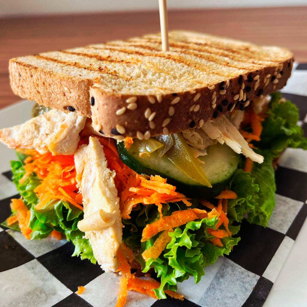 Pan ligeramente tostado con pollo a la plancha, mayonesa, lechuga, espinacas, zanahoria, jitomate, pepino, queso blanco o queso amarillo y chiles en vinagre.