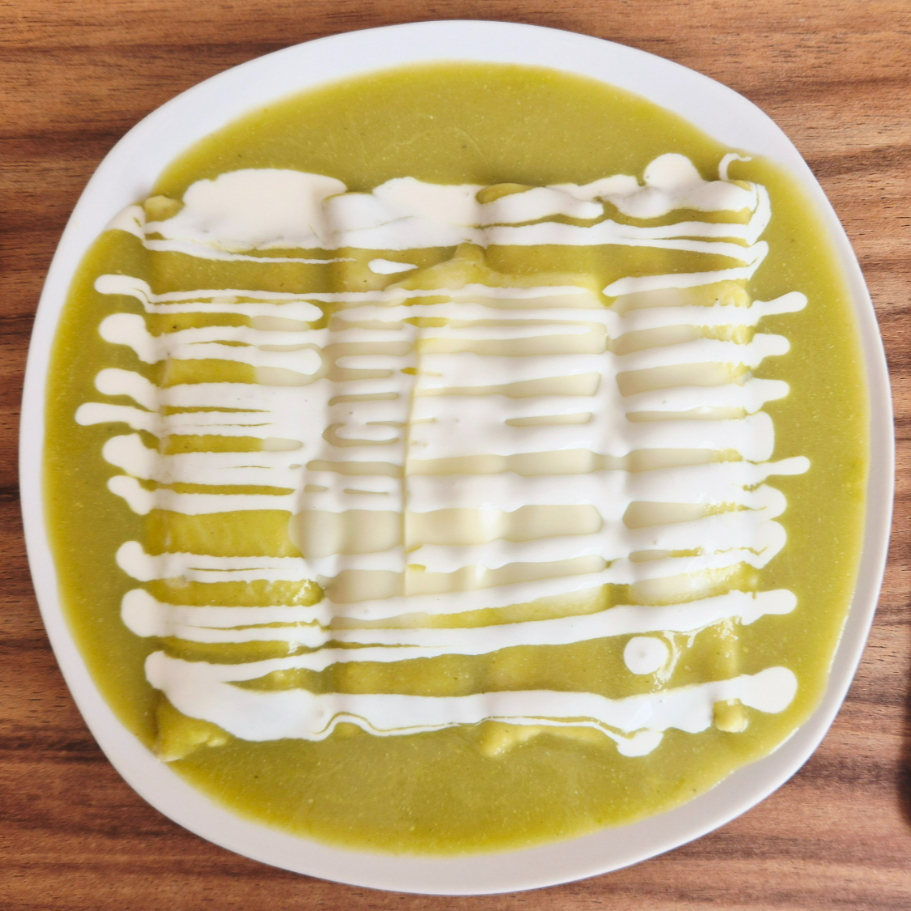 Orden de 4 enchiladas suizas rellenas de pollo, con crema y queso gratinado.