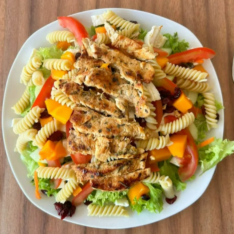 Una mezcla de lechuga, espinacas, zanahoria, pasta, jitomate, mango, pepino, queso panela, arándanos, crutones, pollo asado, acompañado de un aderezo de mostaza y miel.