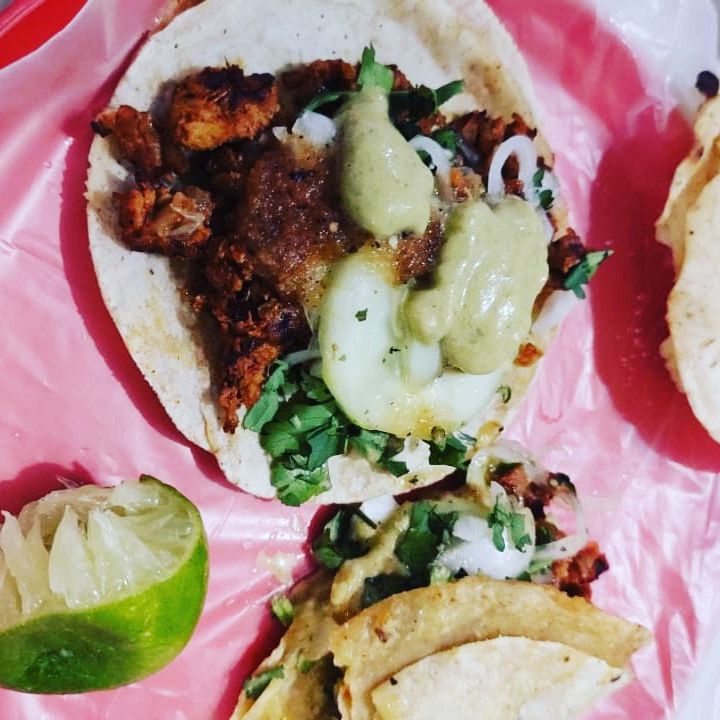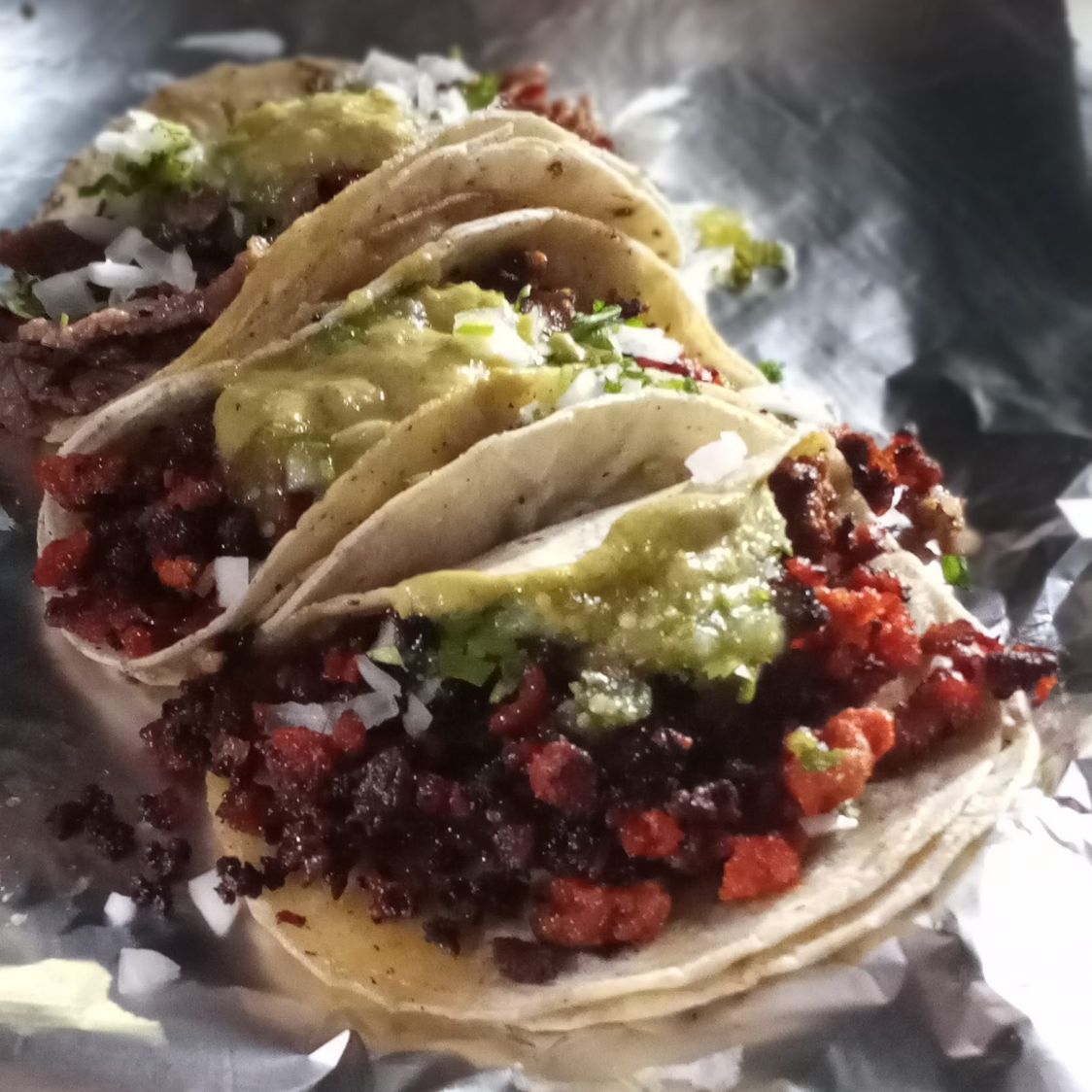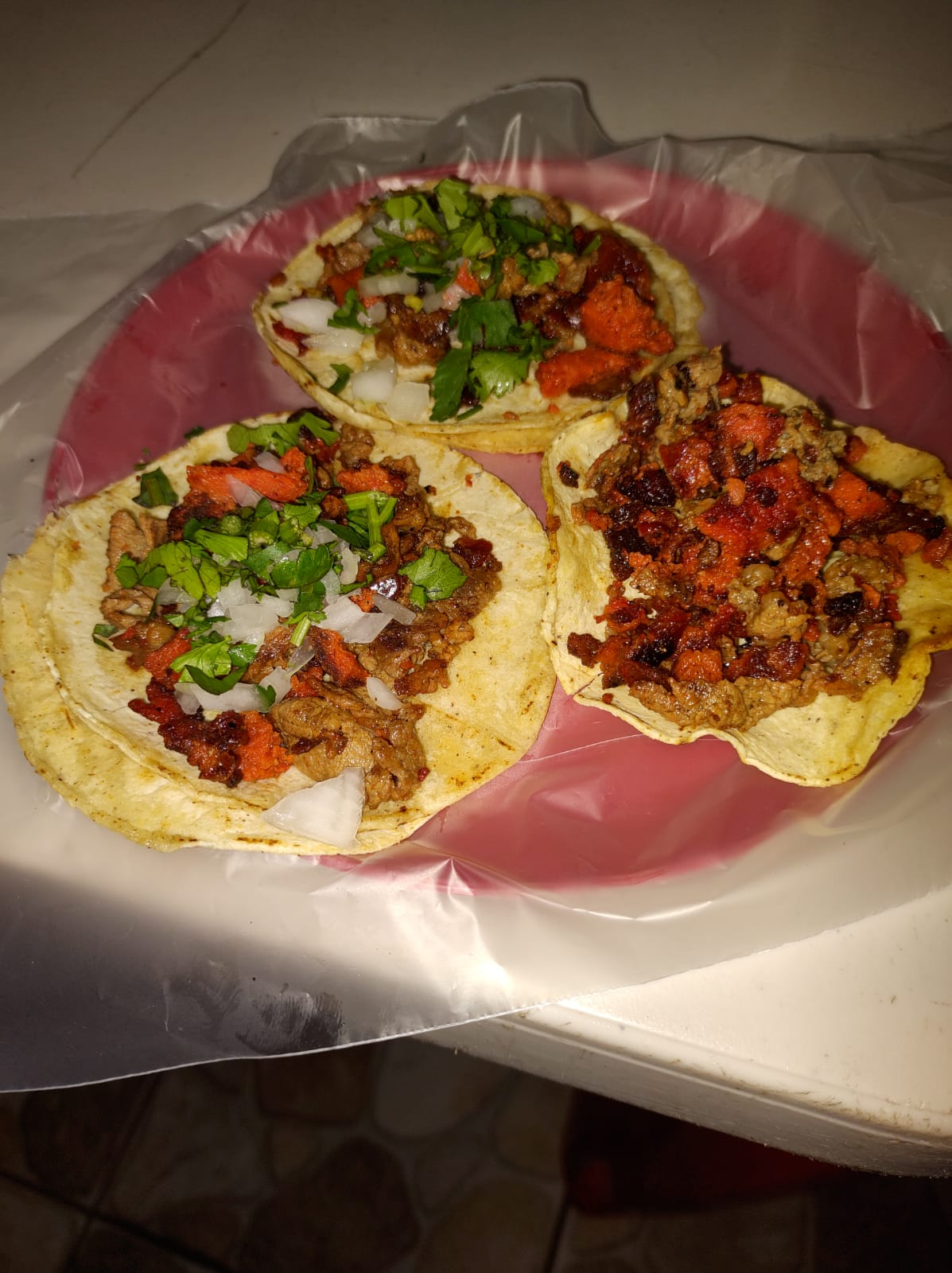 Dos tortillas de maíz chicas con carne, queso, cebolla y cilantro.