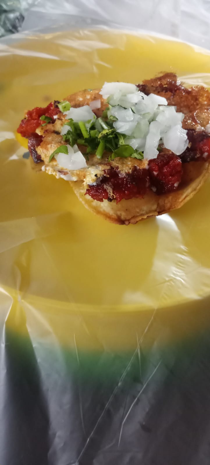 Una tortilla dorada de maíz chica con queso, carne, cebolla y cilantro.