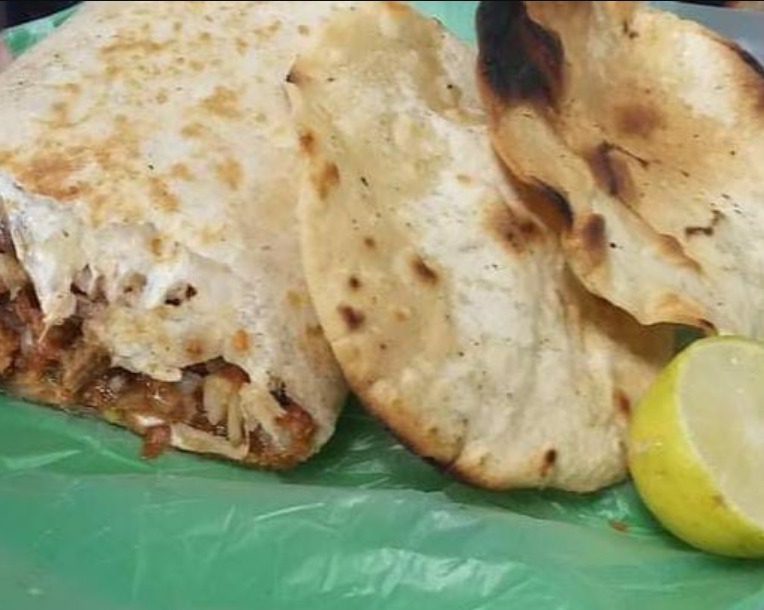 Una tortilla de harina de 30 cm aproximadamente con carne, queso, cebolla y cilantro.