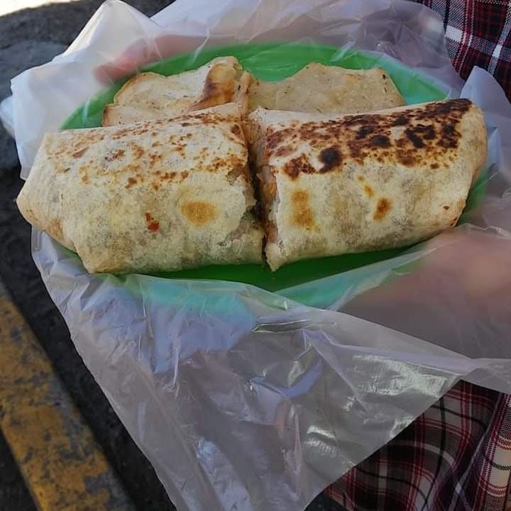 Una tortilla de harina de 30 cm aproximadamente con carne frijoles queso y verdura.