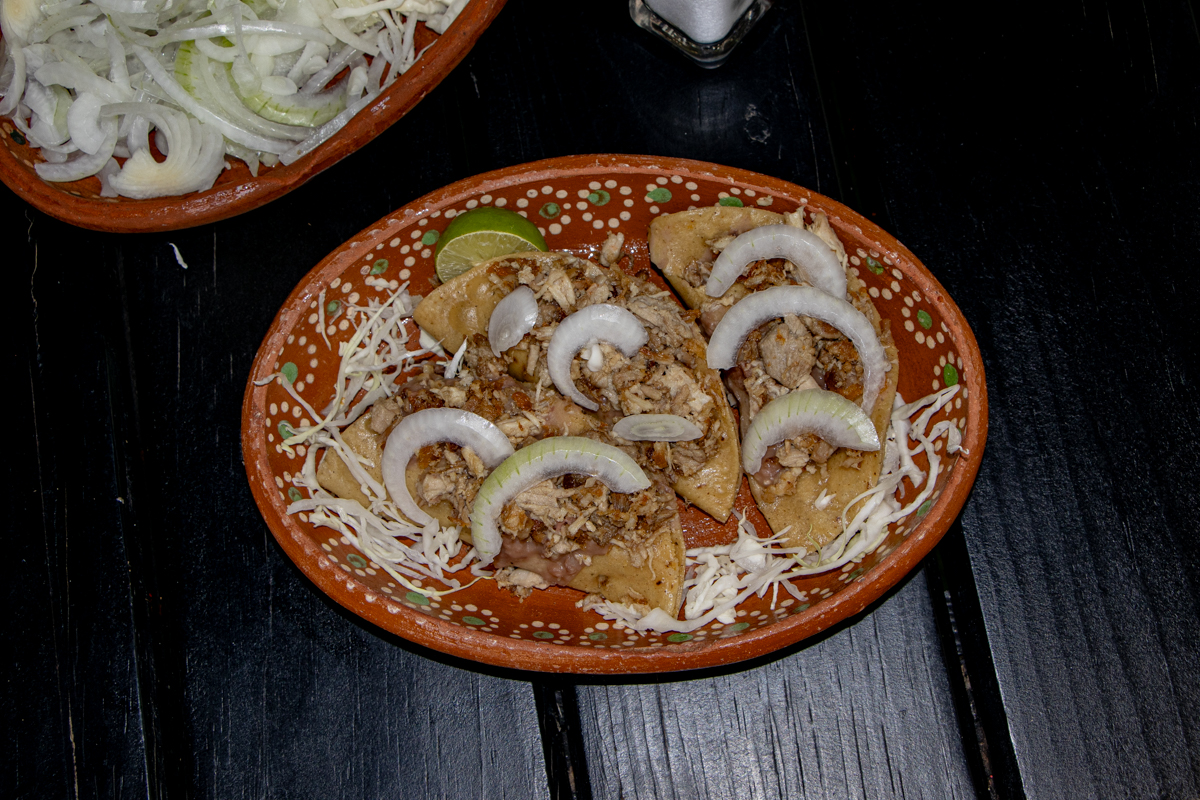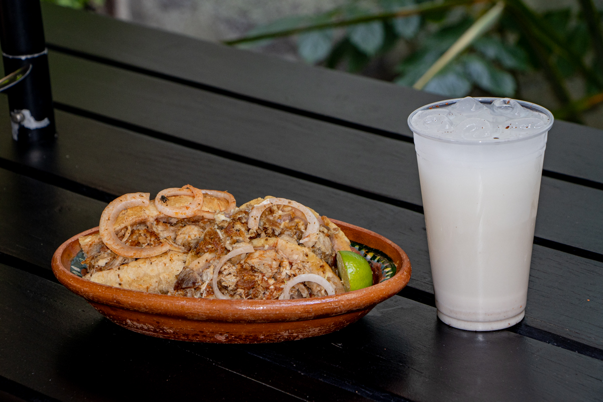Taco dorado de papa o chicharrón, cubierto de carnitas y frijoles o queso panela y frijoles. Acompañado de salsa de jitomate, salsa picante, cebolla, repollo y limón.