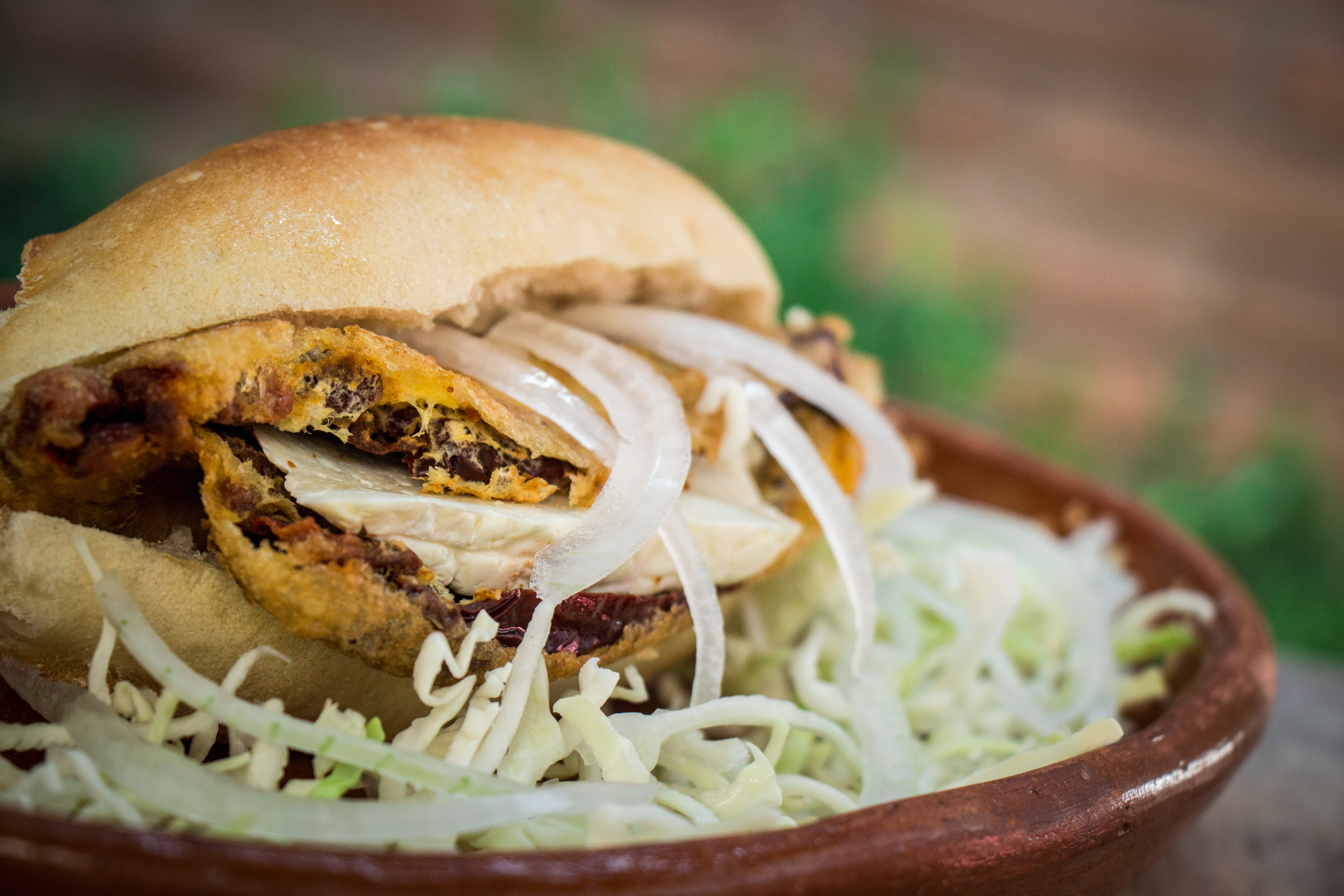 Torta de chile capeado, relleno de queso panela. Acompañada de cebolla, salsa jitomate, salsa picante y limón.