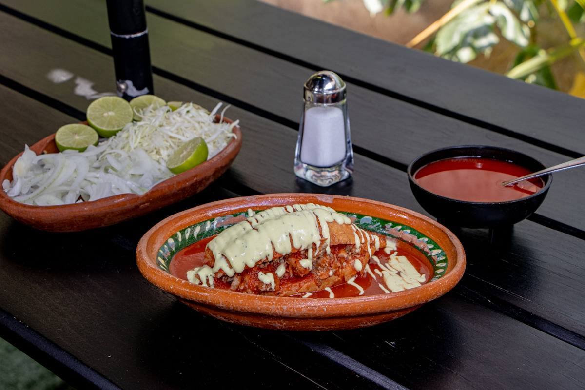 Torta ahogada con carnitas y frijoles o queso panela y frijoles. Acompañada de salsa de jitomate, salsa picante, cebolla y limón.