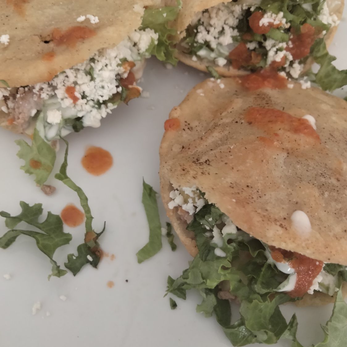 Tortilla con frijol,queso,crema ,cebolla lechuga y guisado