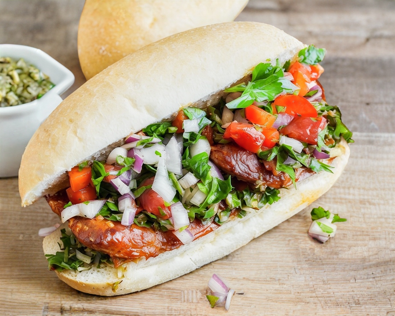Chorizo argentino en barrita de pan, acompañado de chimichurri argentino, jitomate y cebolla.