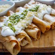 Orden de tacos fritos rellenos de pollo o papa, con crema y salsa.