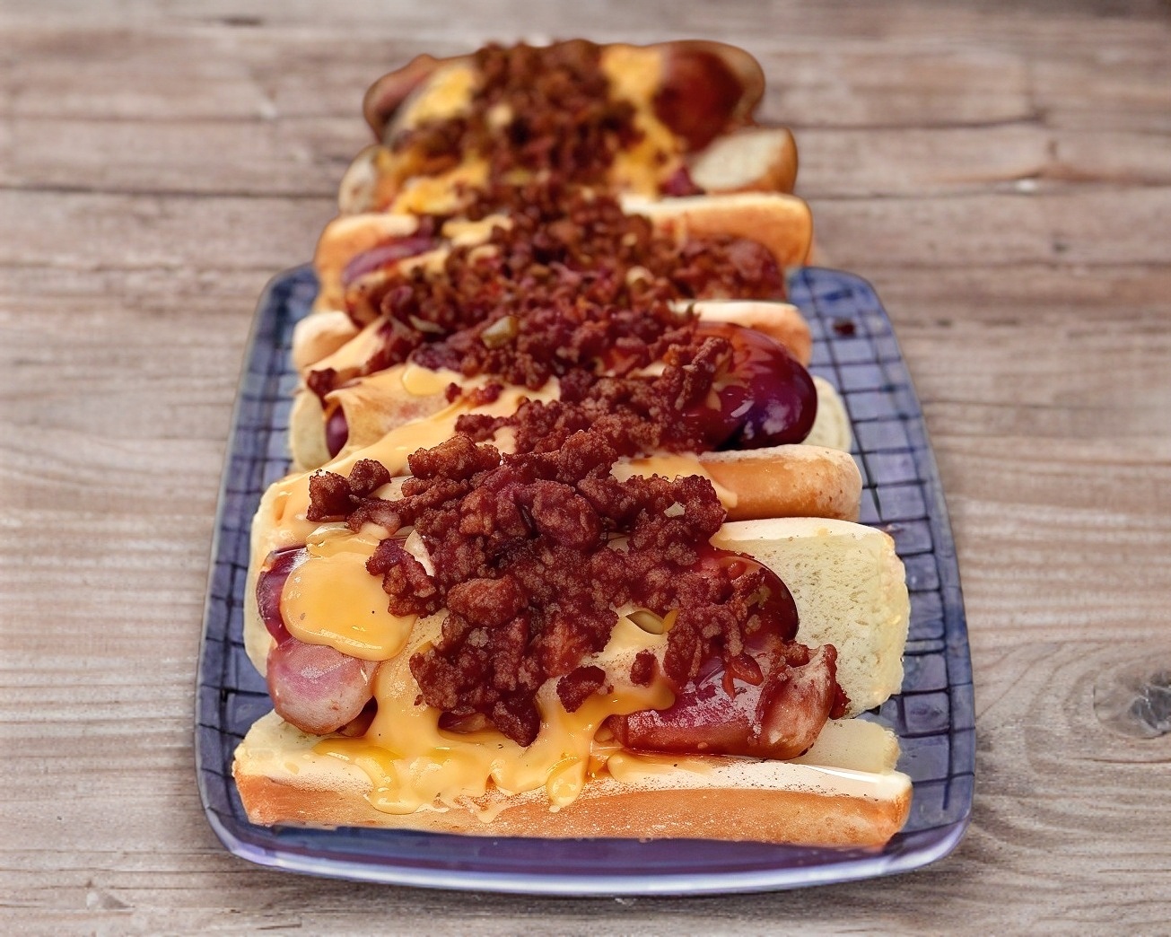 Salchicha rellena de queso envuelto en tocineta con capa extra de queso jalapeños y Doritos Nacho