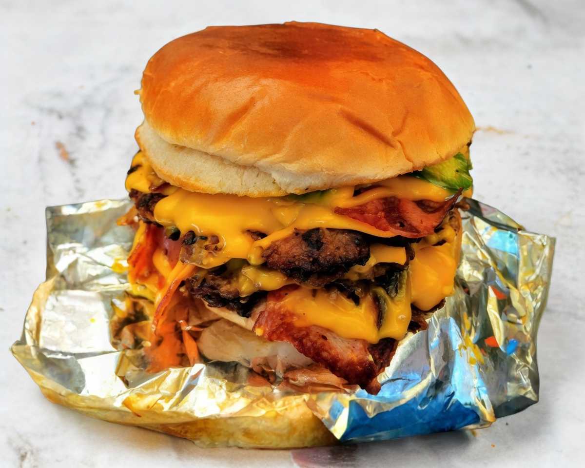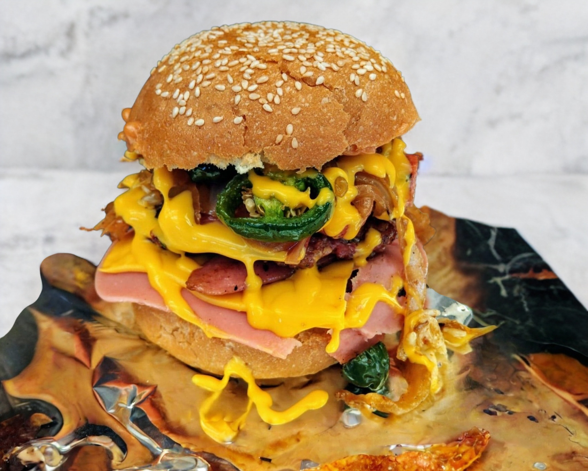 3 carnes, triple tocino, 3 quesos, cebolla caramelizada y jalapeño