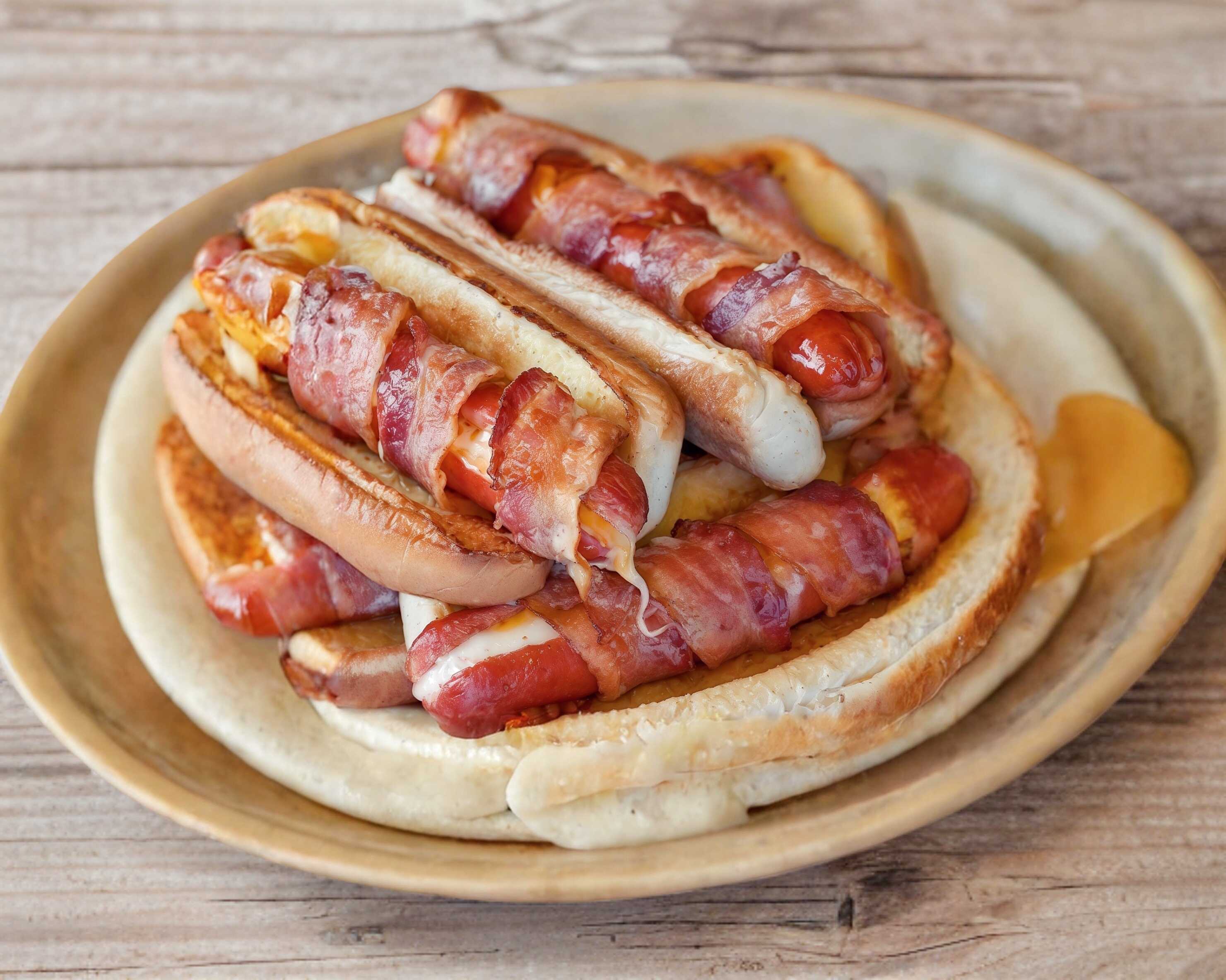 Salchicha envuelta en tocino rellena de queso con una capa de queso extra y tocineta