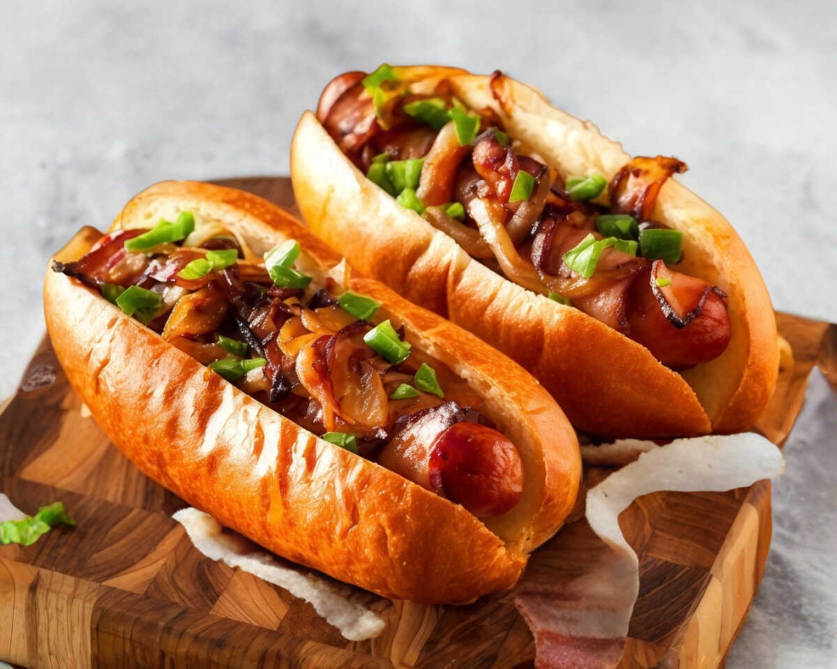rico Hot-Dog con queso Oaxaca, tocino, cebollita a caramelizada y aderezo especial