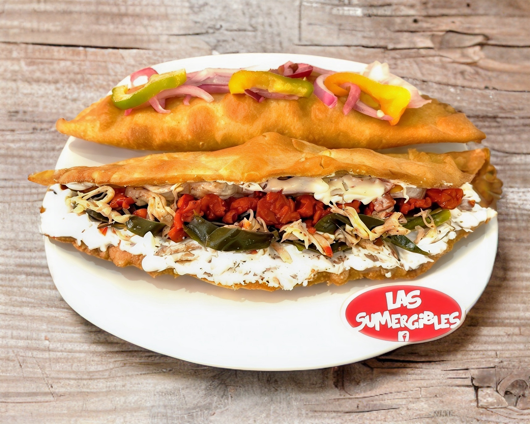 Quesadilla frita de maíz con jamón, carne con rajas y queso.