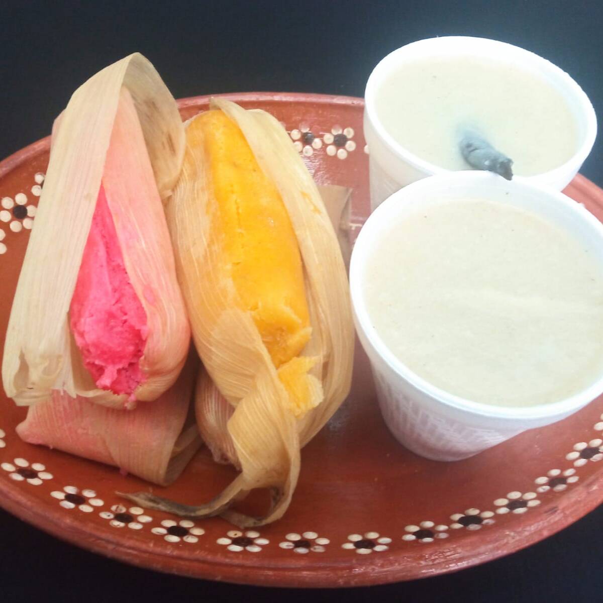 2 tamales rojos o verdes, 2 atole personal, 2 buñuelos enmielados