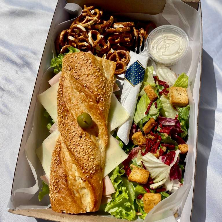 Salami, queso suizo, mix orgánico de lechugas, baguette artesanal. Todos los baguette INCLUYEN: ensalada orgánica de mix de lechugas, crutones, chips de temporada, pretzels y un aderezo.
