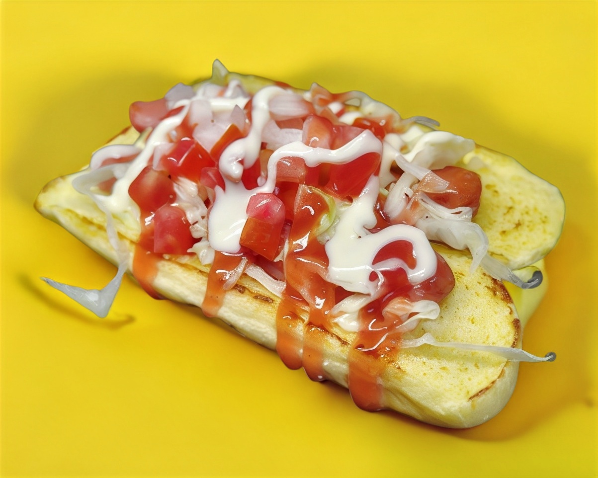 Salchicha de pavo acompañada de lechuga, jitomate, cebolla, crema, catsup y mostaza.