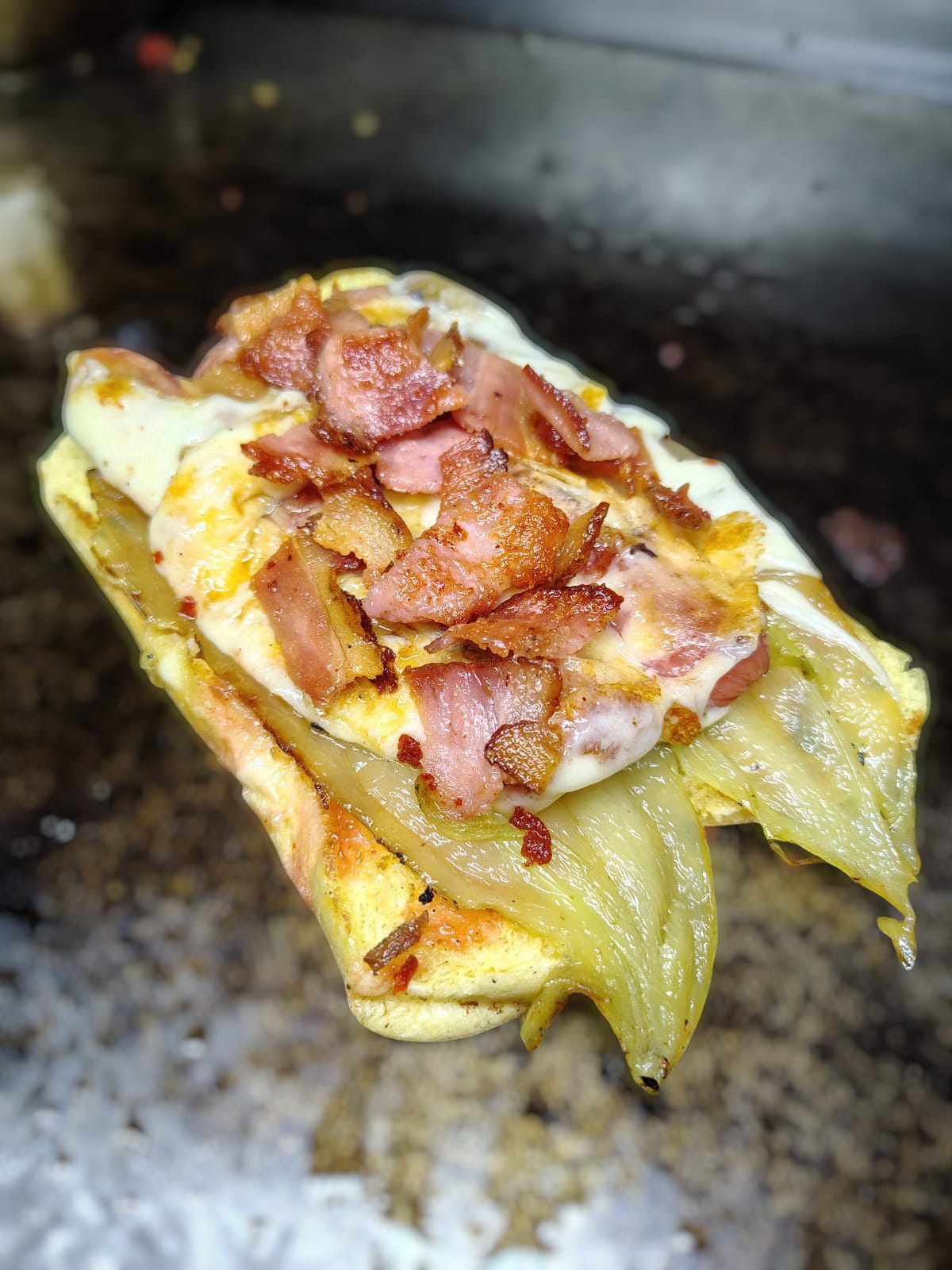 Salchicha de pavo acompañada con queso asadero, tocino, verduras y liquidos.