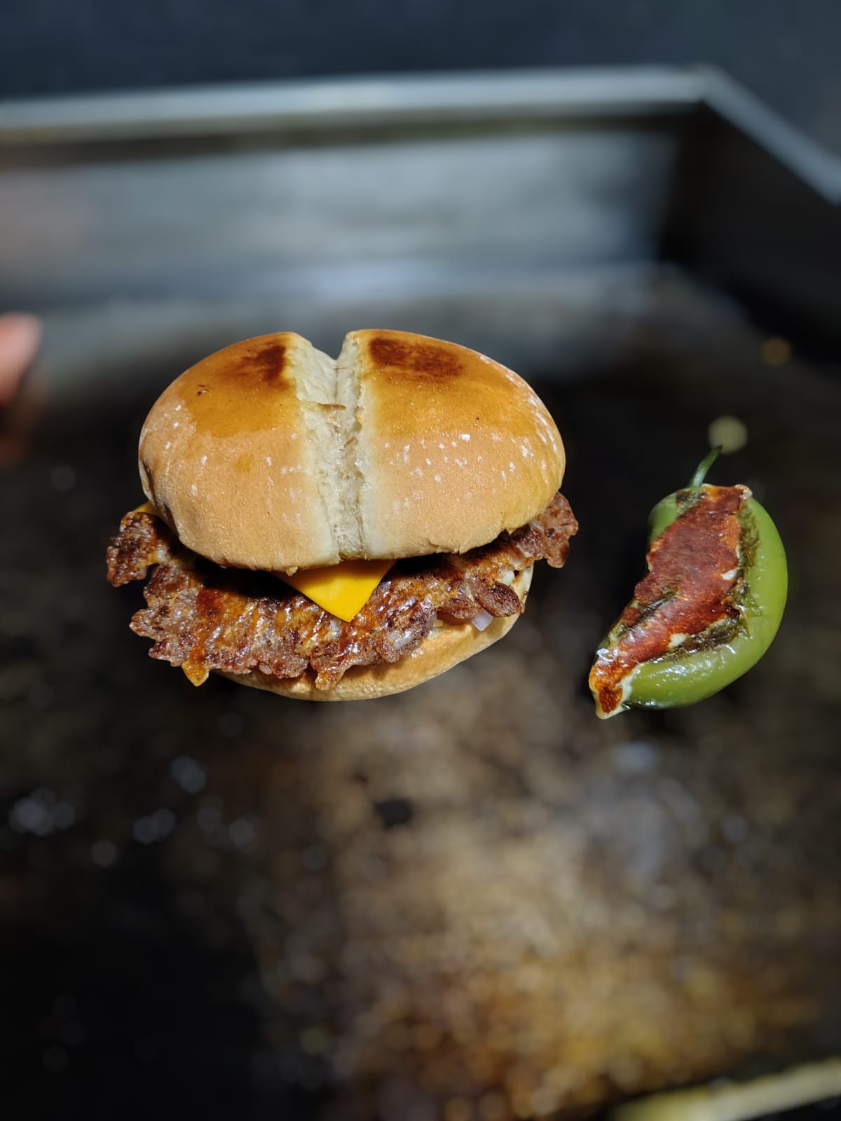Hamburguesa con tenders de pollo crujiente,cebolla caramelizada, pan suave, vegetales frescos y aderezo ranch.