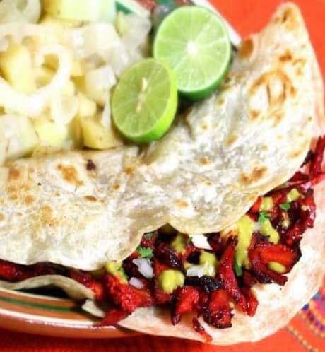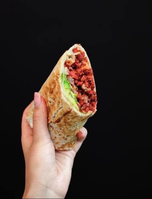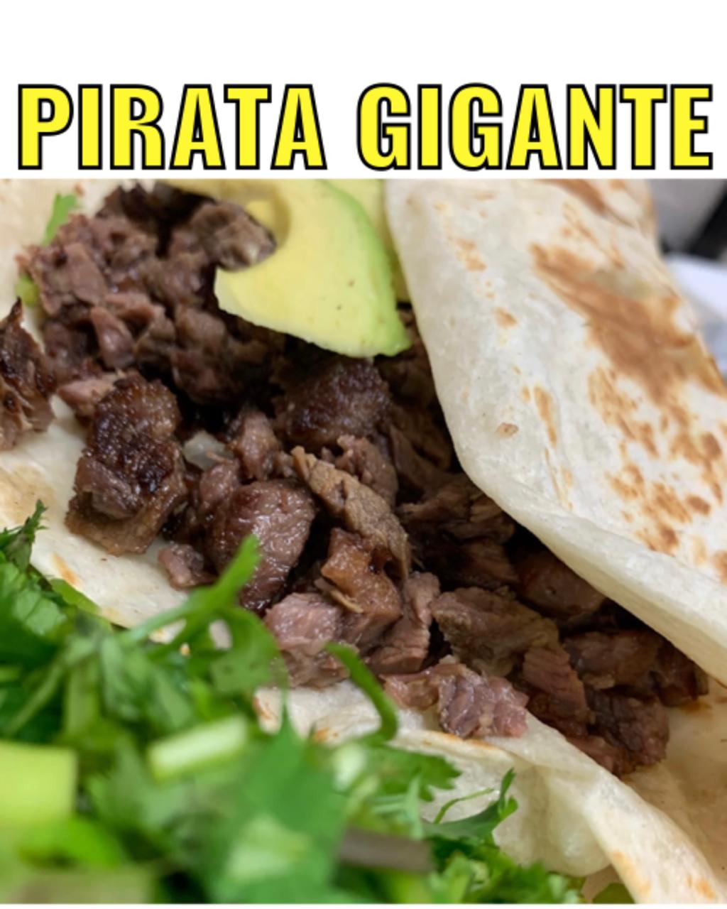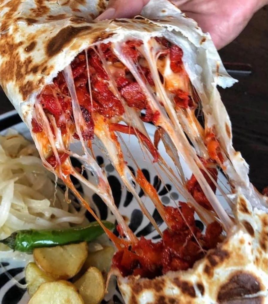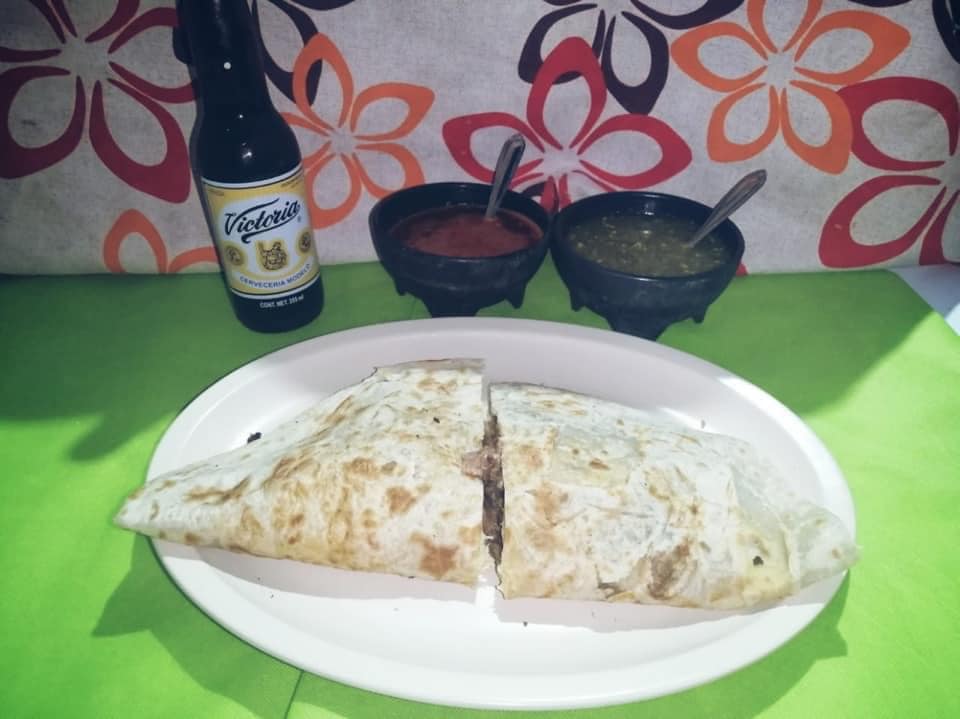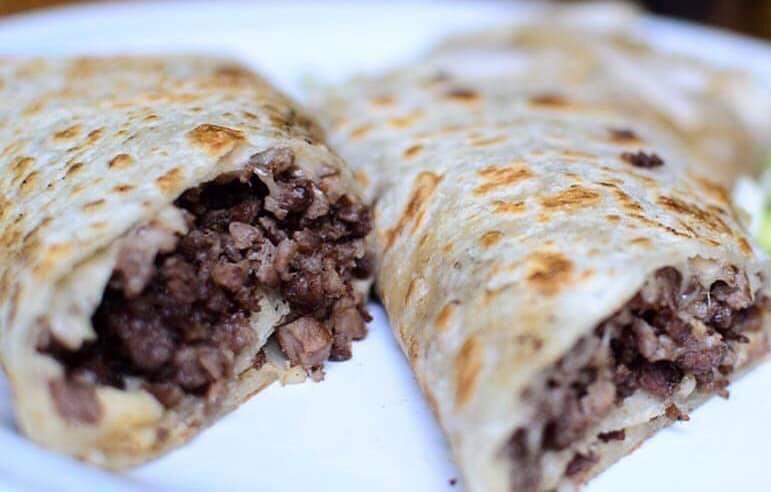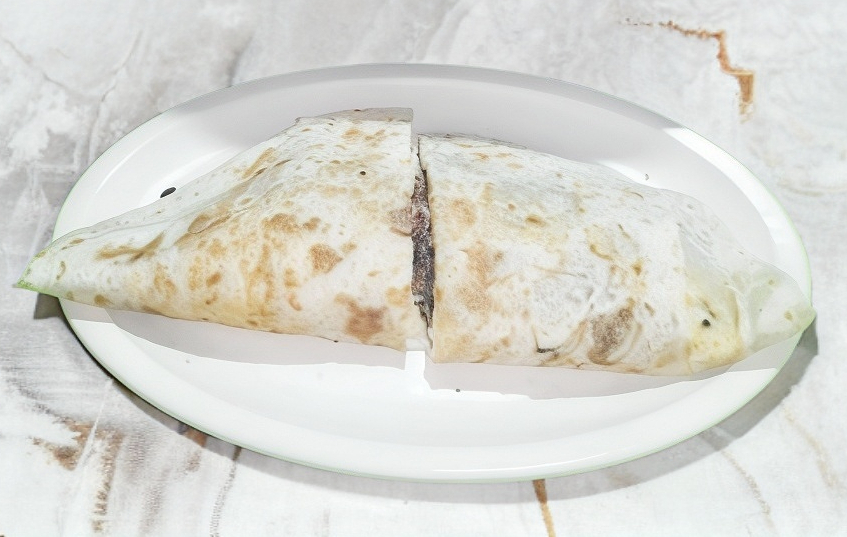 Tortilla grande de harina con queso asadero, frijol y aguacate