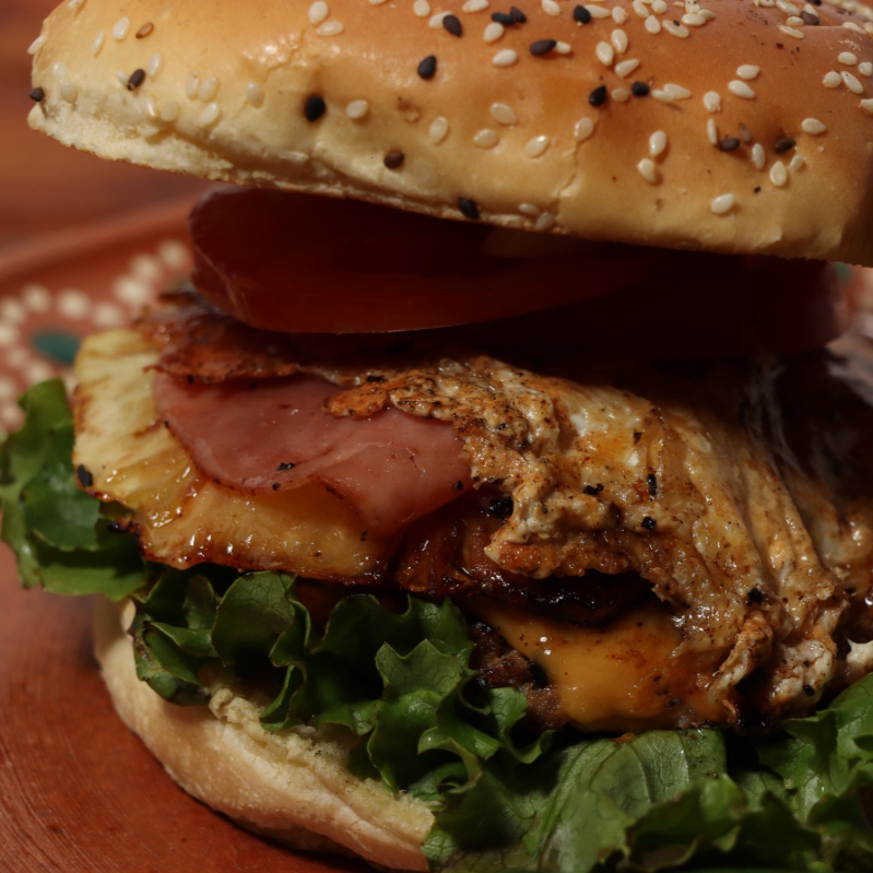 Preparada con pan parrillero, 150 gr de carne de res receta de la casa, jamon, piña, queso americano, costra de queso, lechuga, jitomate, cebolla, mayonesa, catsup y mostaza, acompañada con papas a la francesa