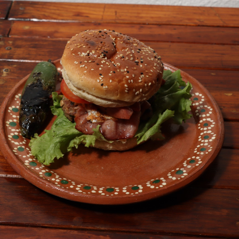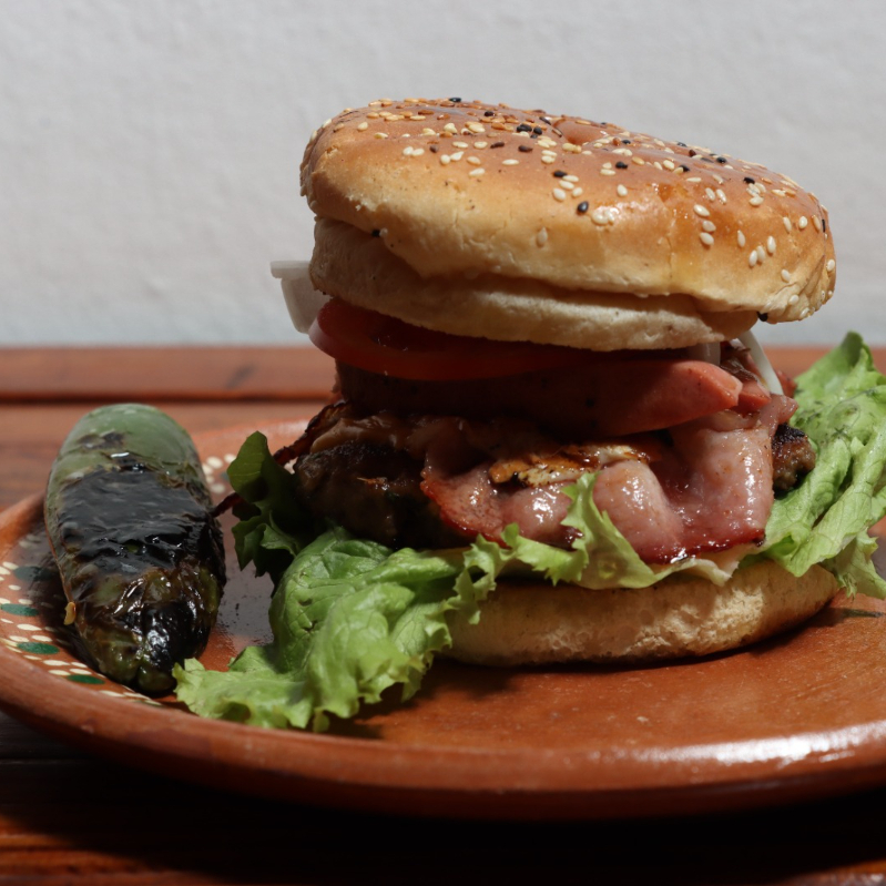 Preparada con pan parrillero, 150 gr de carne de res receta de la casa, tocino, queso americano, costra de queso, lechuga, jitomate, cebolla, mayonesa, catsup y mostaza, acompañada con papas a la francesa