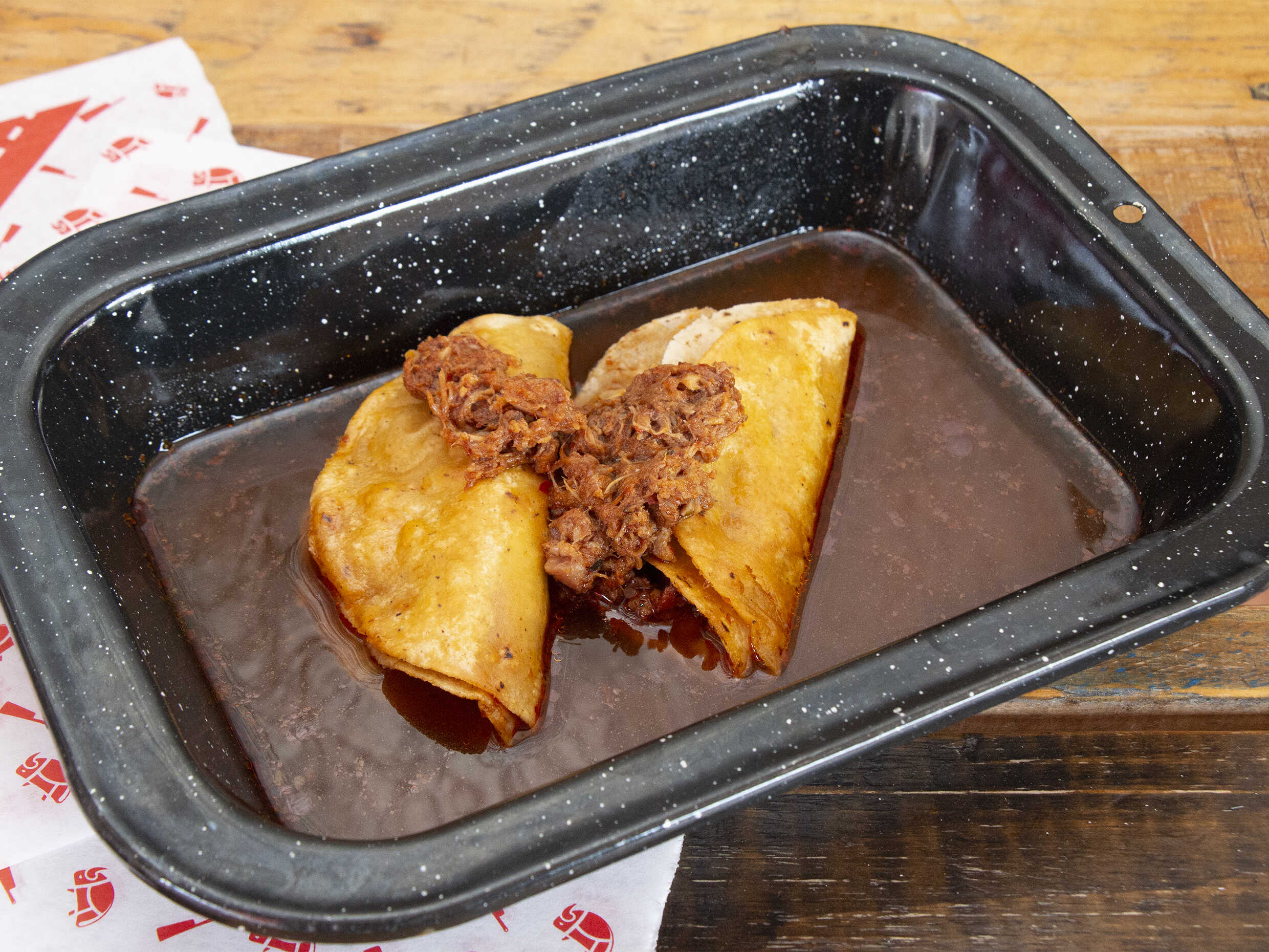 Rico taco dorado de barbacoa de res ahogado en consome