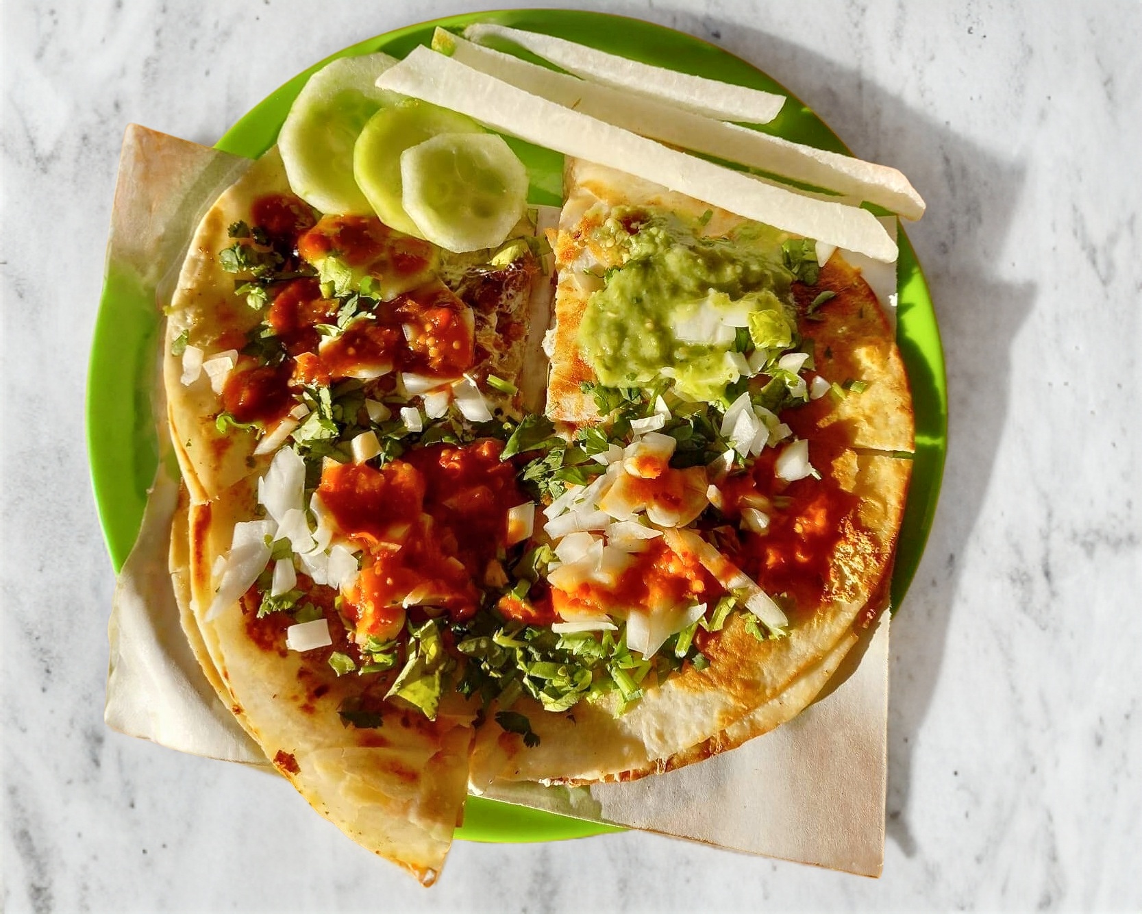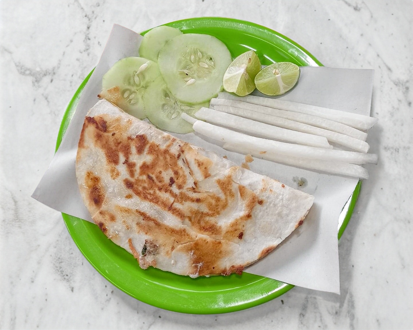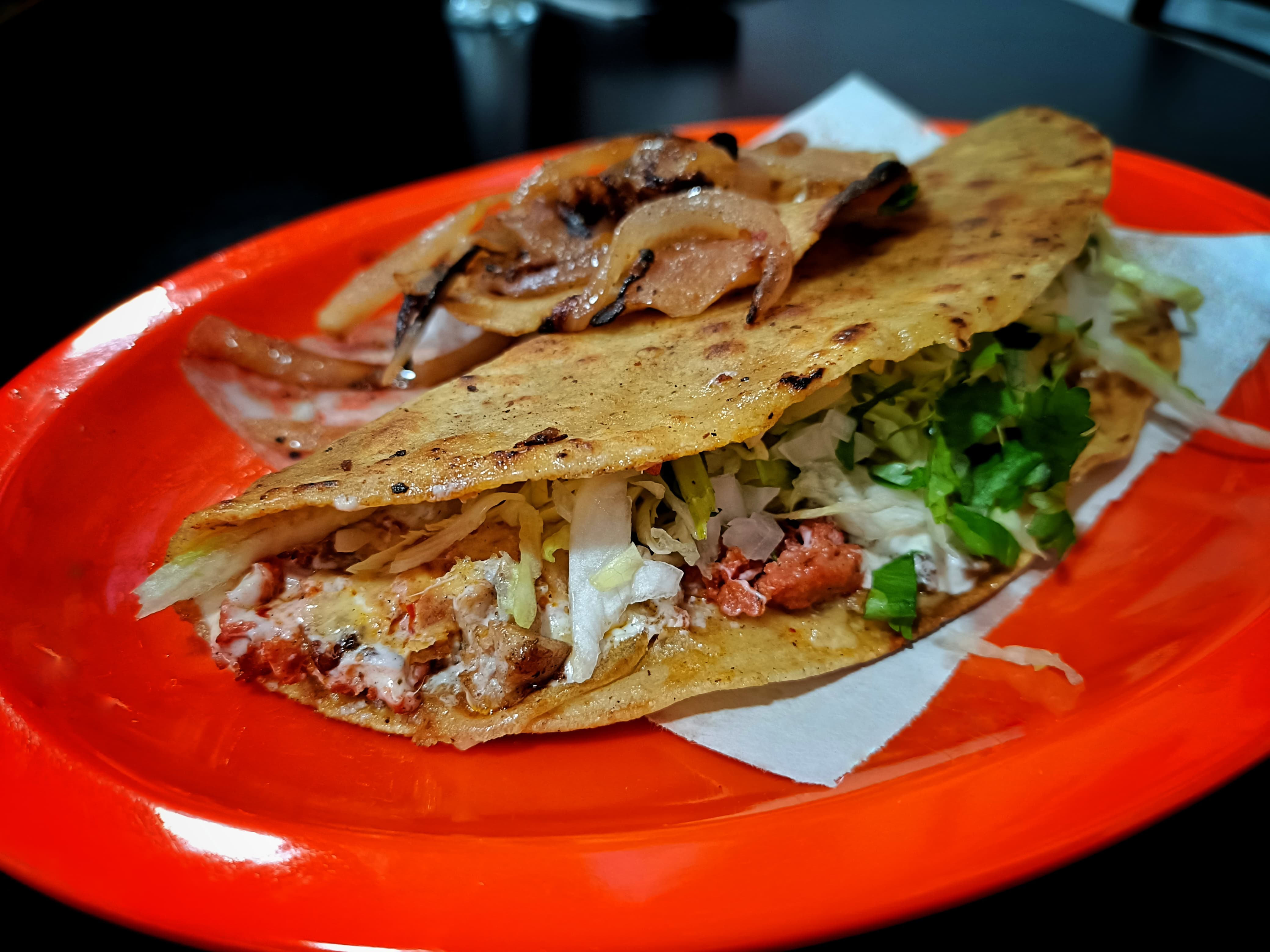 Tortilla de harina, queso y la carne de tu elección acompañado con cilantro y cebolla. Recuerda que no solo pagas el producto sino también el servicio de DiDi
