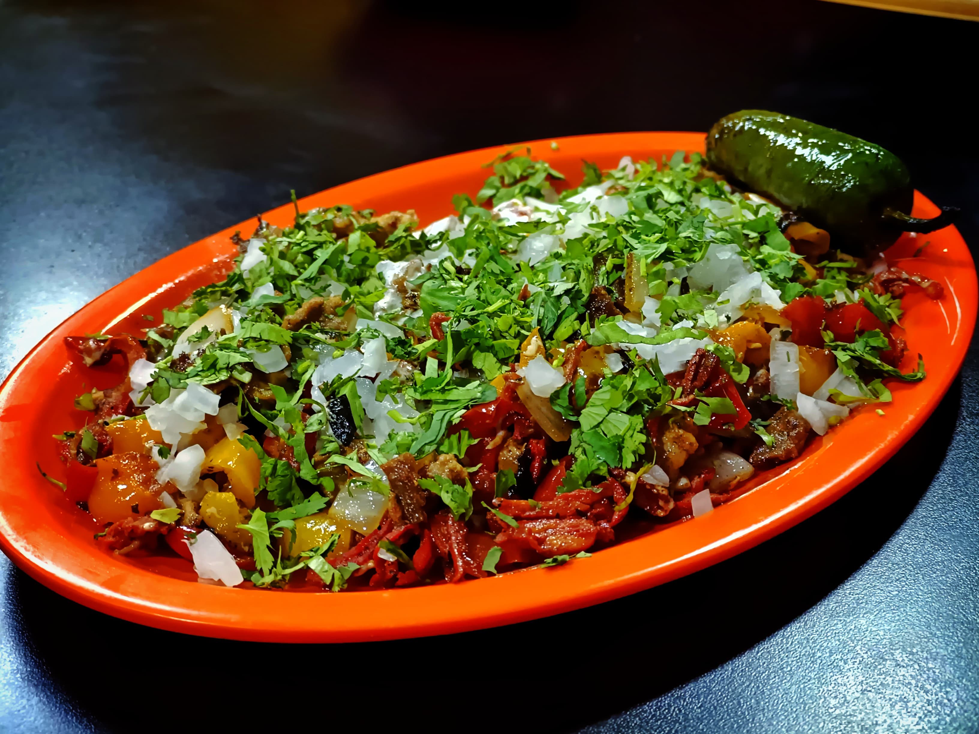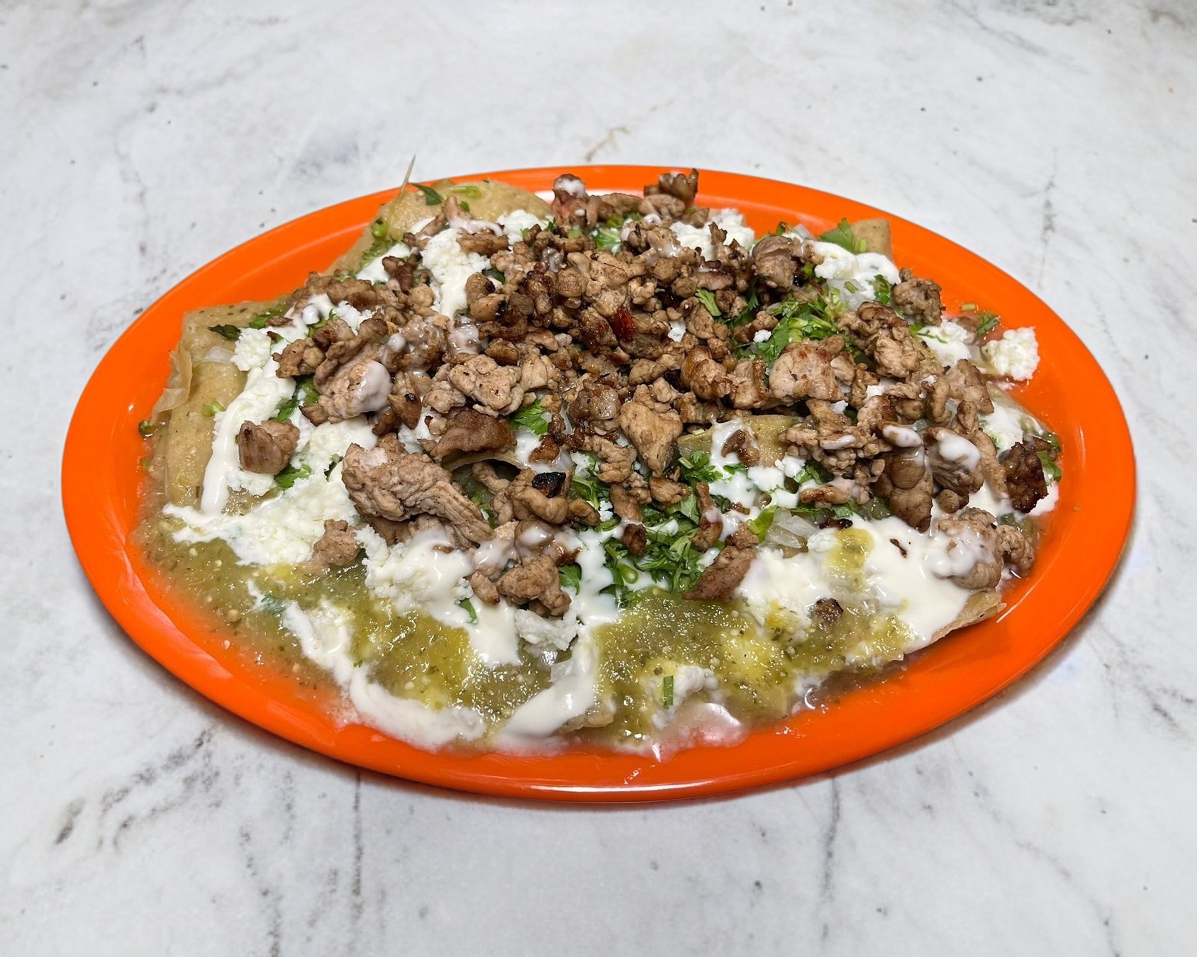 Los chilaquiles más deliciosos con tu carne preferida acompañado con tortillas de maíz, cilantro y cebolla. Recuerda que no solo pagas el producto sino también el servicio de DiDi