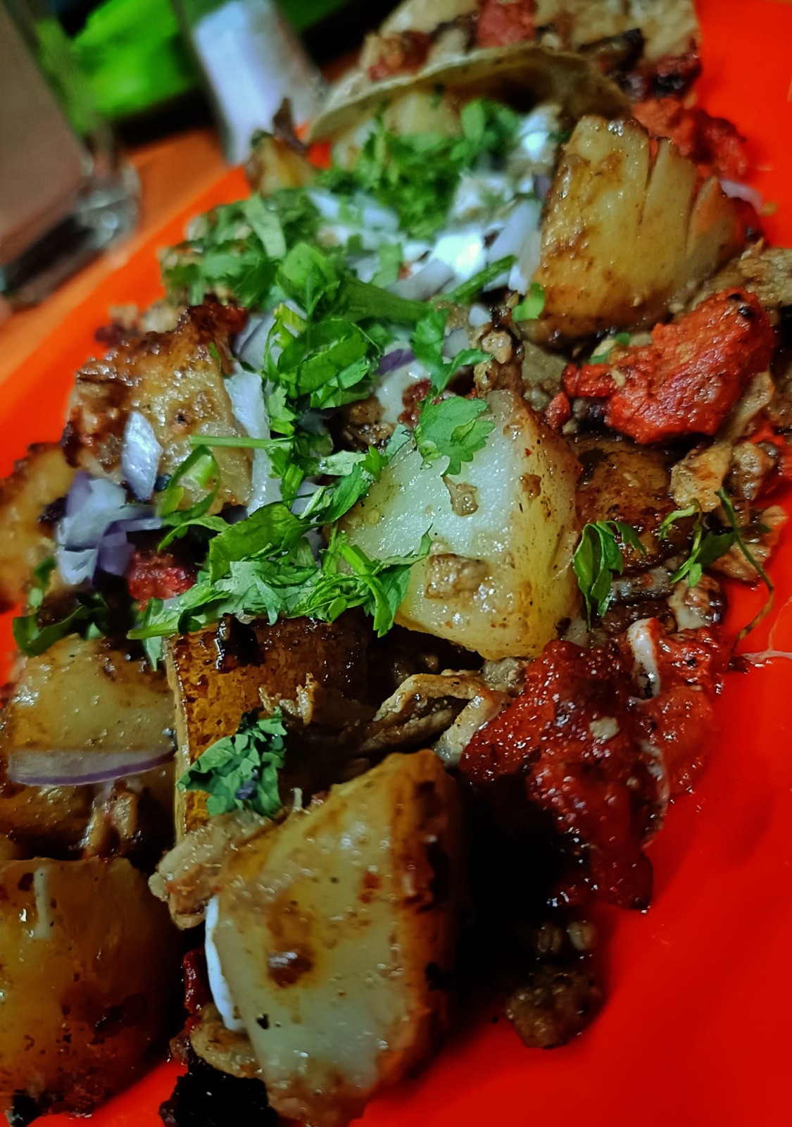 Dos tortillas de harina, queso y la carne de tu elección acompañado cilantro y cebolla. Recuerda que no solo pagas el producto sino también el servicio de DiDi