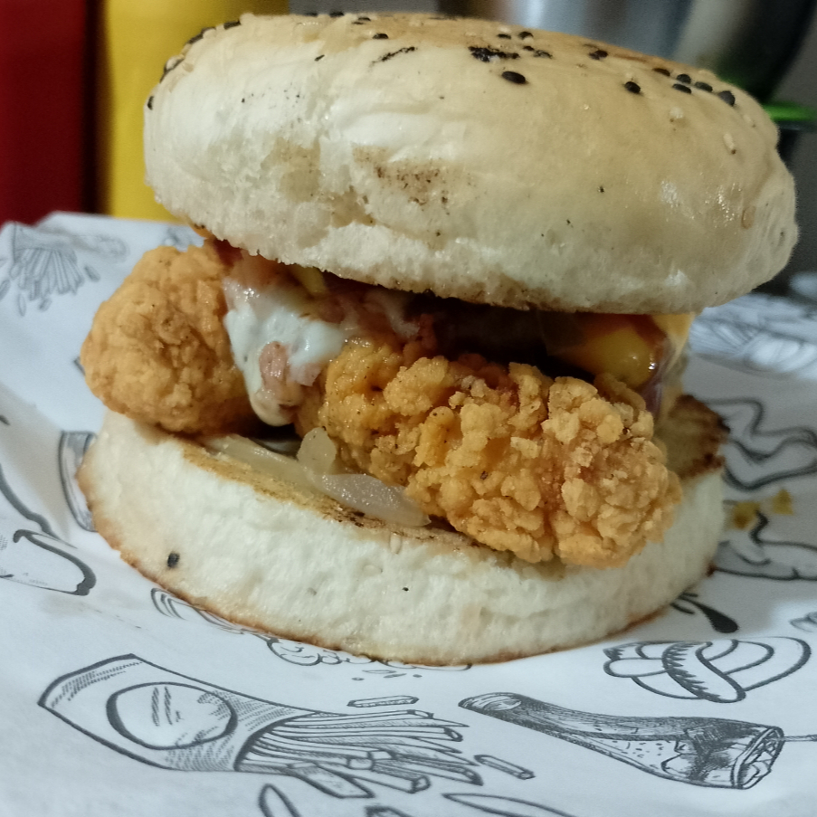 hamburguesa con trozos de pechuga de pollo empanizados con mayonesa, mostaza, catsup, queso de nachos, pepinillos, cebolla asada y chile