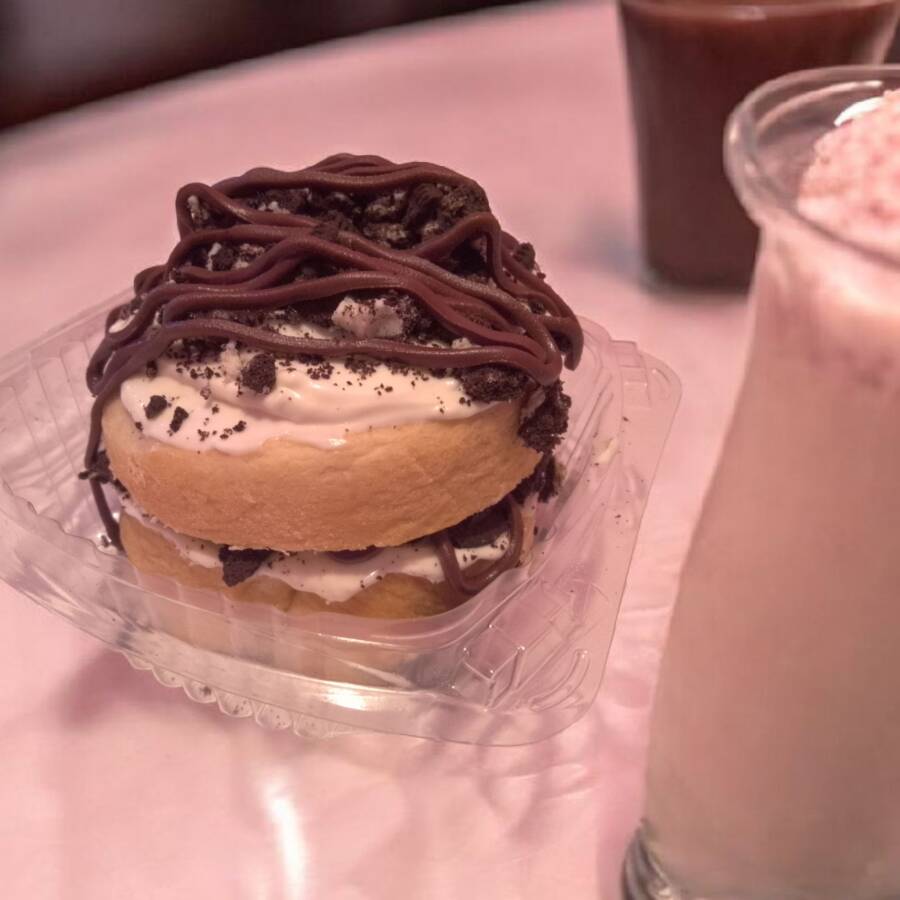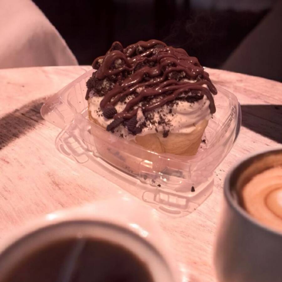 Rol de canela partido por la mitad relleno de glaseado y galleta oreo