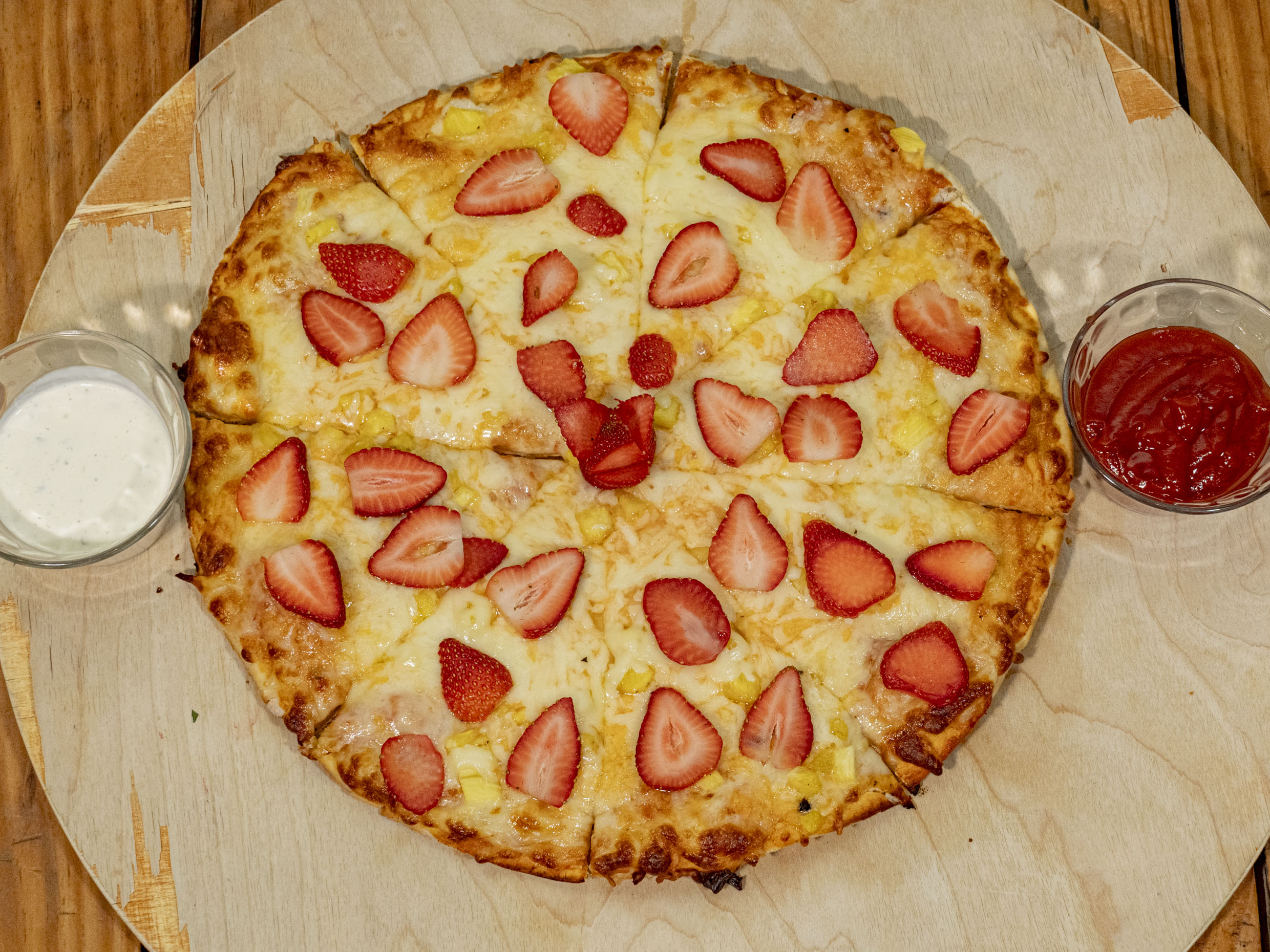 Un festín de sabores con quesos provolone, parmesano y mozzarella derretidos, combinados con piña dulce y fresas frescas. La combinación perfecta de sabores salados y dulces