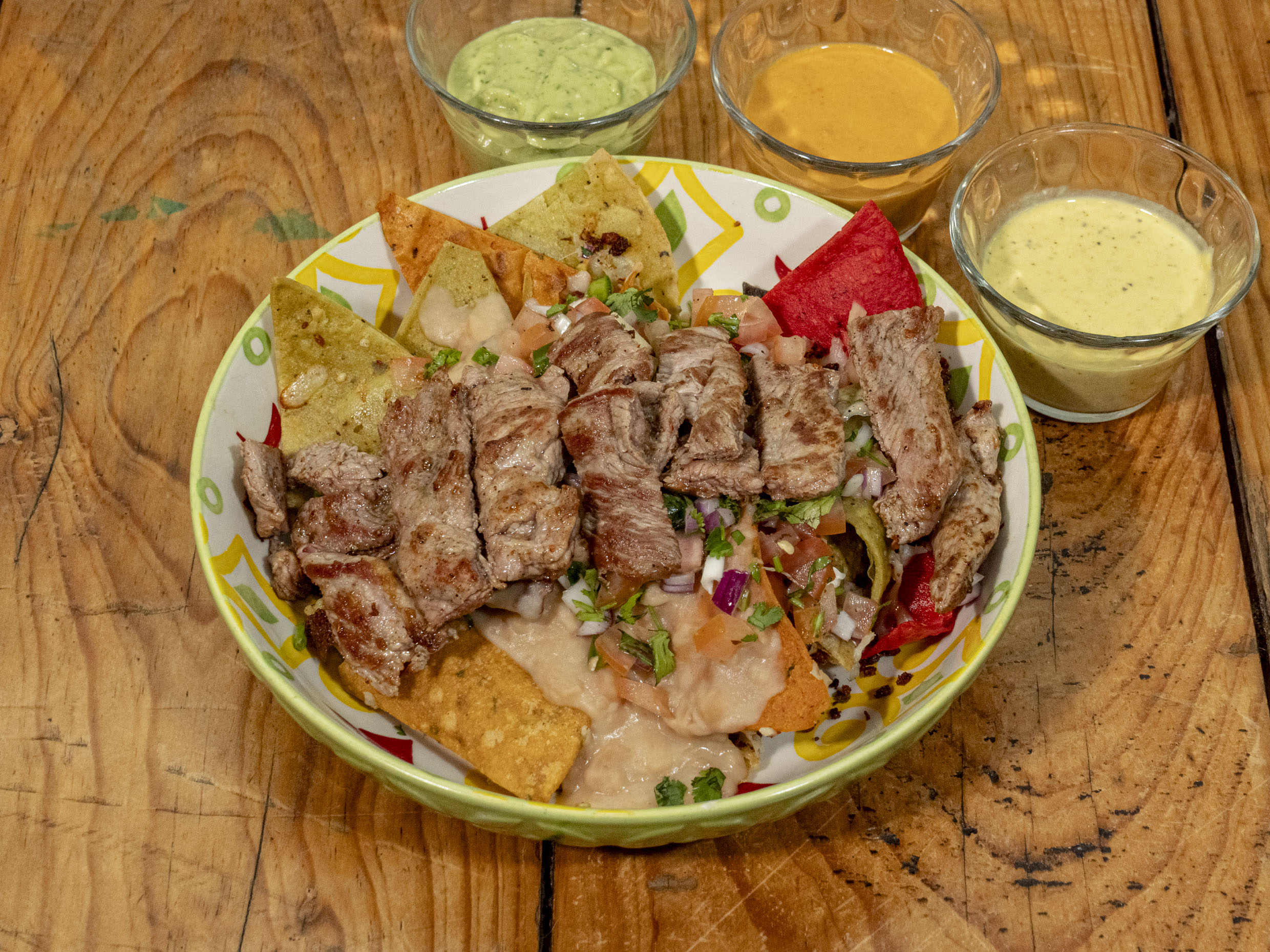 Nachos crujientes cubiertos con frijoles, queso asadero fundido, chorizo sabroso, filete de res jugoso, pico de gallo fresco y guacamole cremoso. ¡Un festín de sabores!