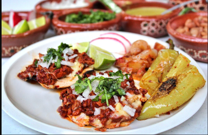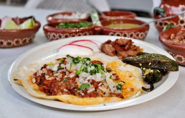 Servida con bistec adobado estilo Zamora Michoacán, acompañado de chile dorado y cebollitas adobadas.