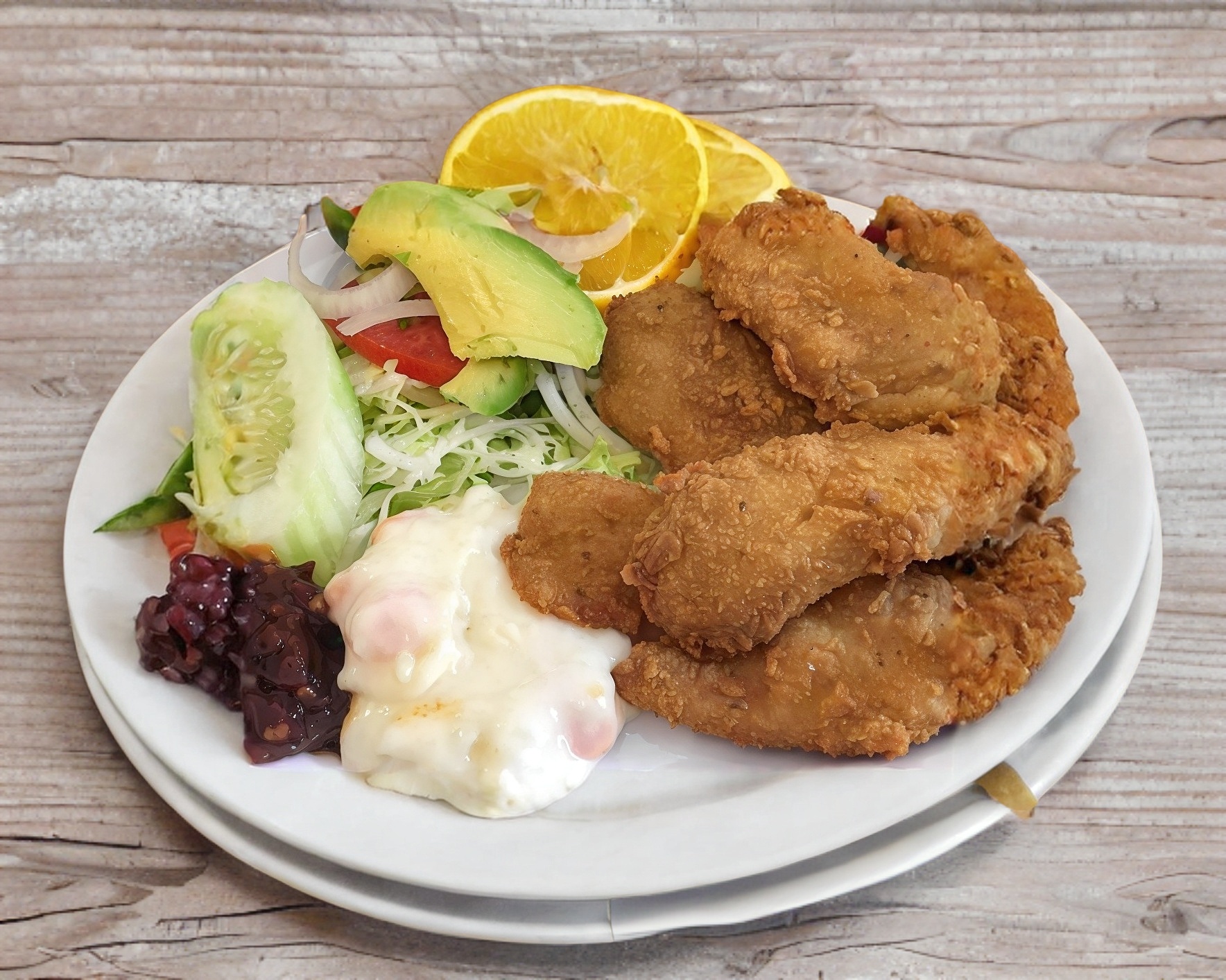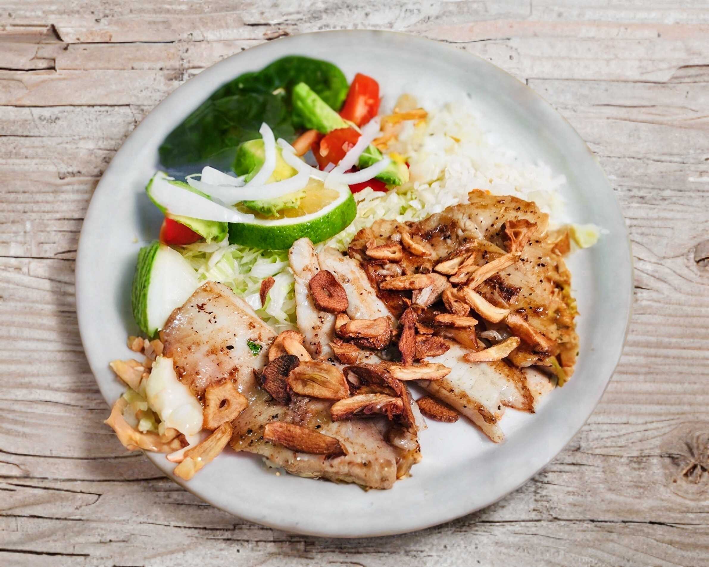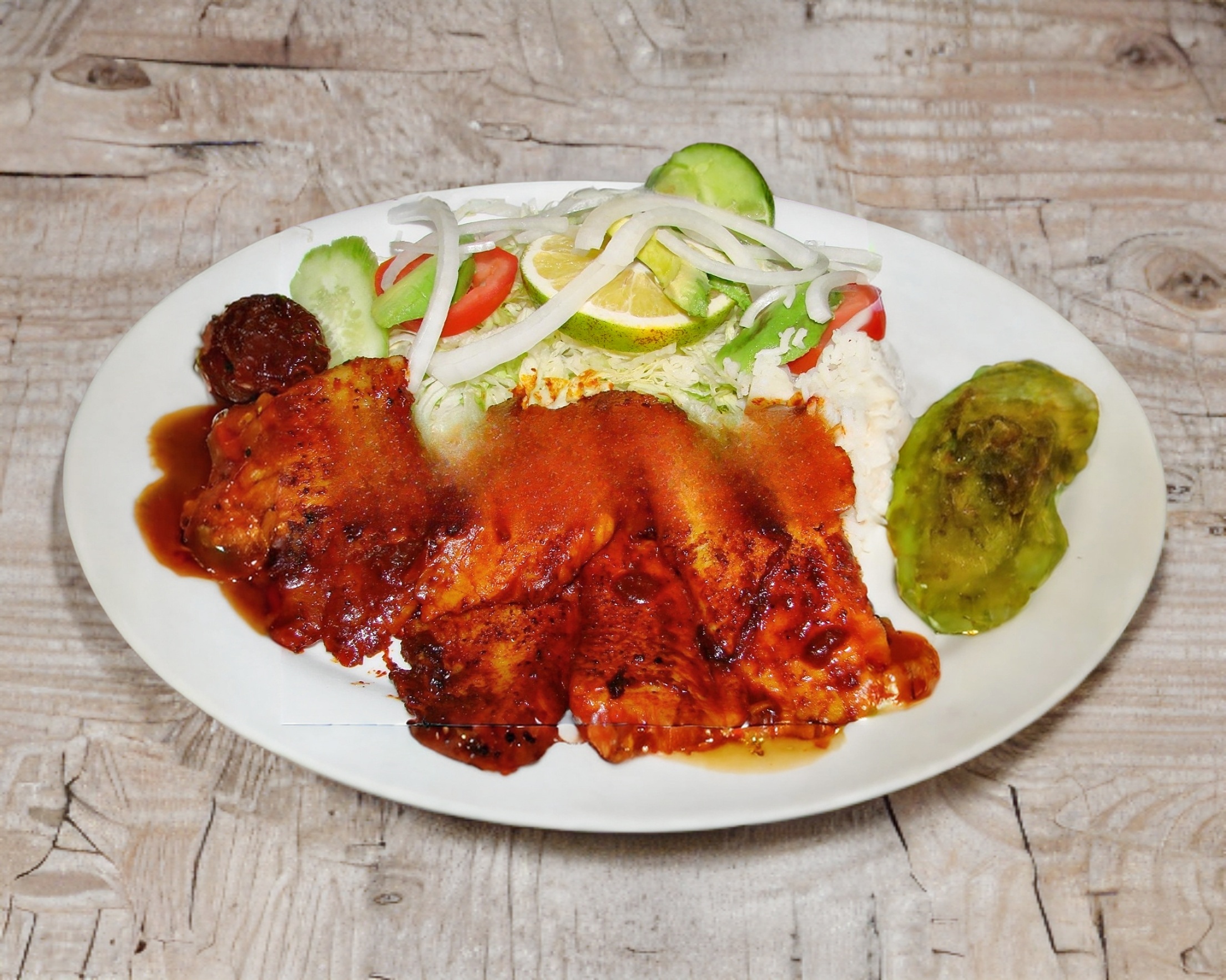 Acompañado con ensalada verde, arroz, aderezo y chile chipotle