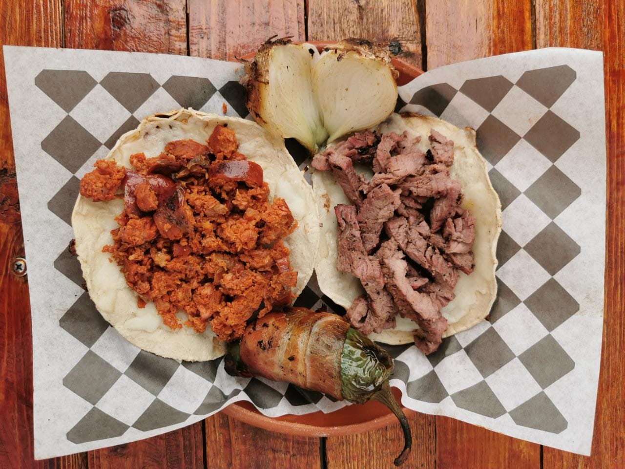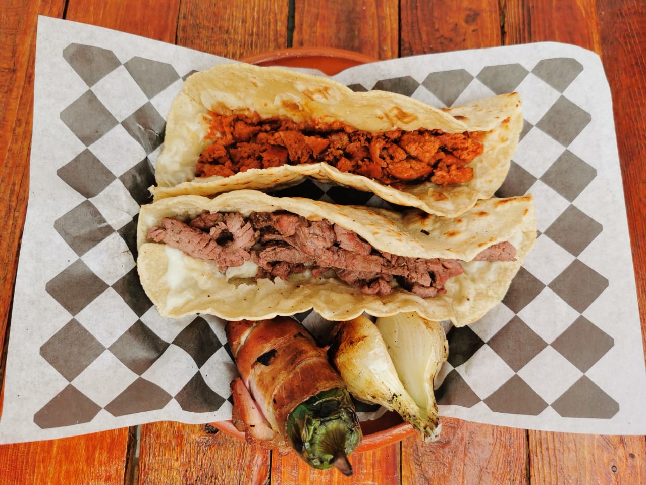 Incluye torillas de comal, frijol, cebollas asadas y salsas.