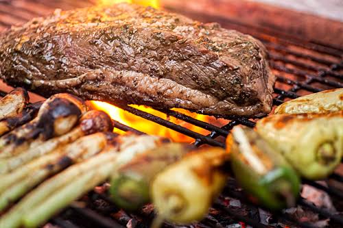 Deliciosa Carne a la leña con 2 tortillas echas a mano (tamaño regular), más complementos.
