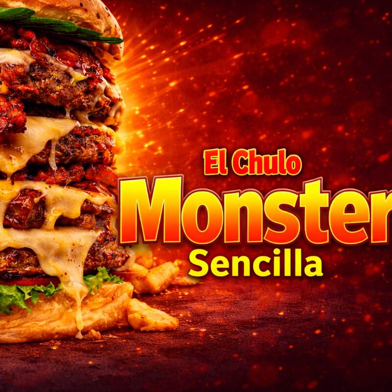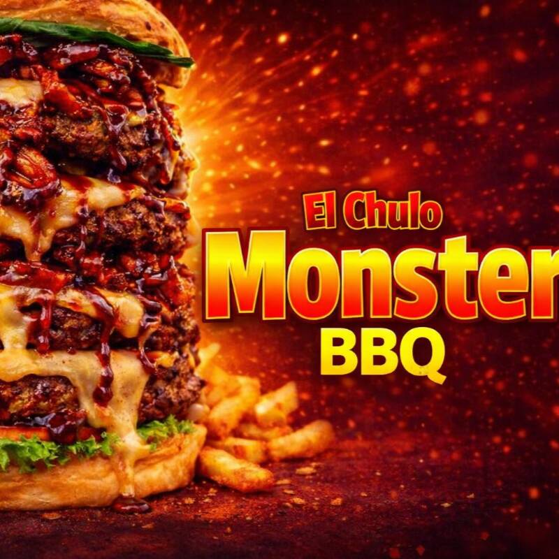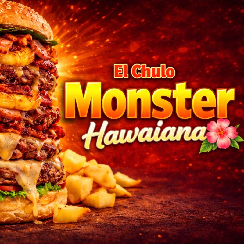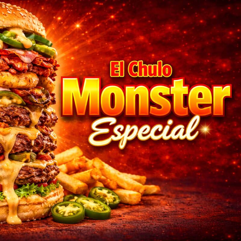 Mega Monster 4 cuatro carnes de res queso Oaxaca asadero jamón salchicha verduras lechuga cebolla y jitomate sus líquidos