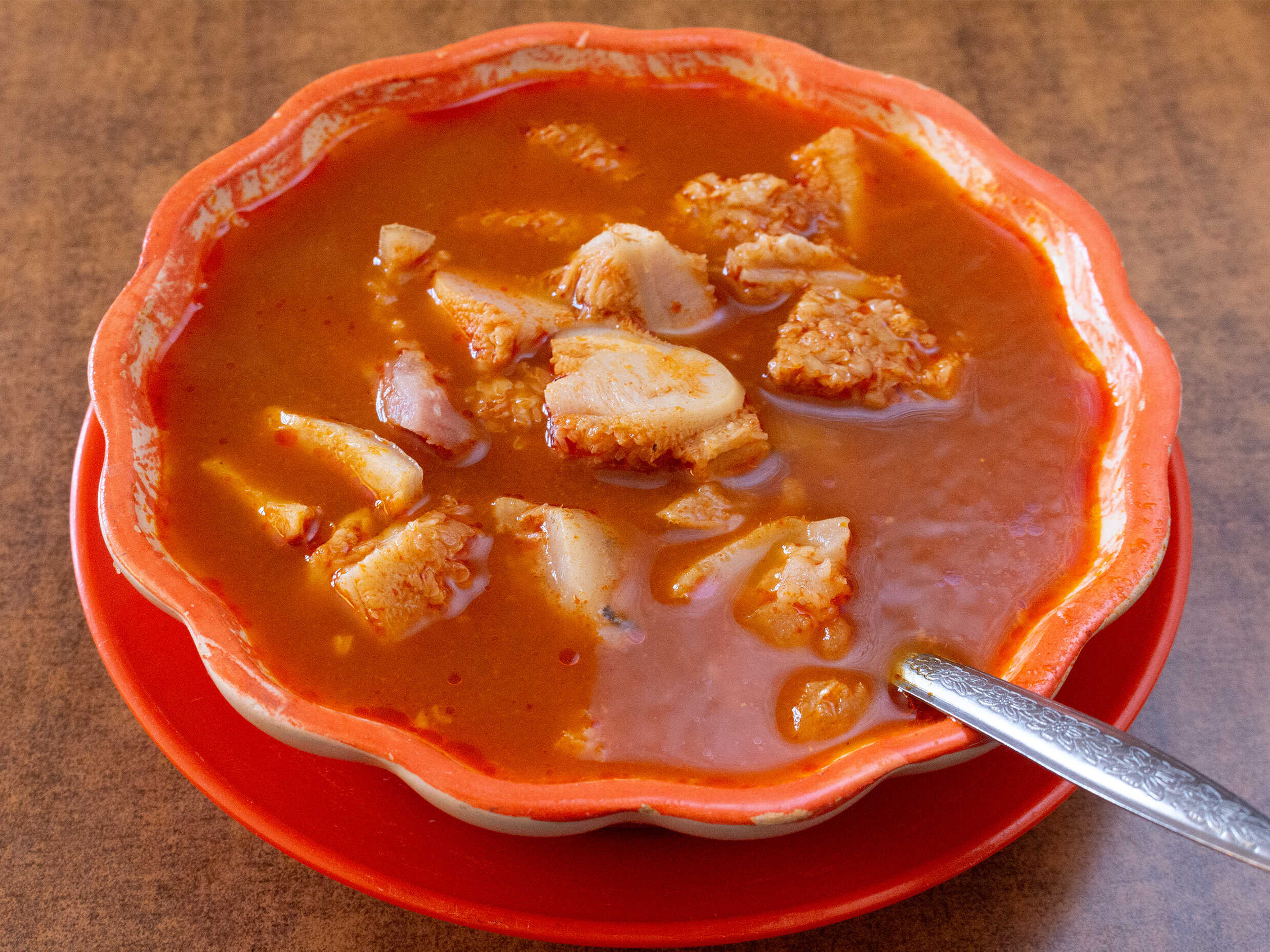 Prueba nuestra sopa de menudo que viene en envase de 1 litro con contenido de menor tamaño, acompañada de salsa roja, 2 limones, cebolla fresca y 4 tortillas, para un festín tradicional y sabroso. (Personal)