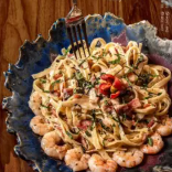 Delicioso fetuccini con camarones guisados con brandy al ajo ,tocino, albahaca fresca y bañada con crema casera .370grs.