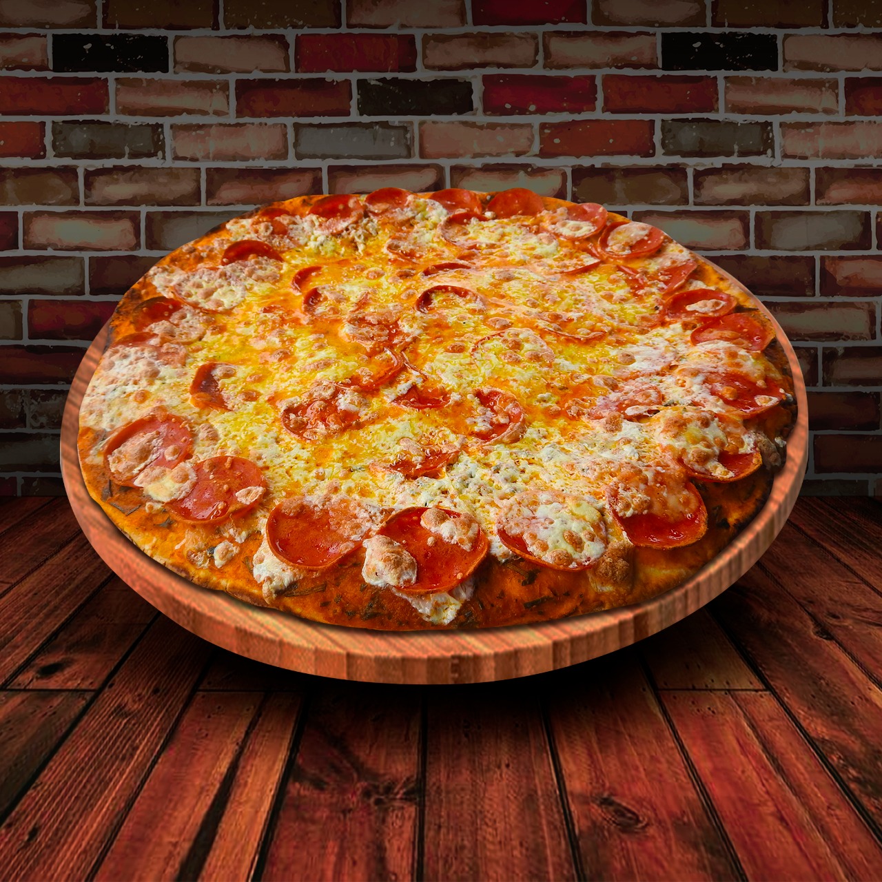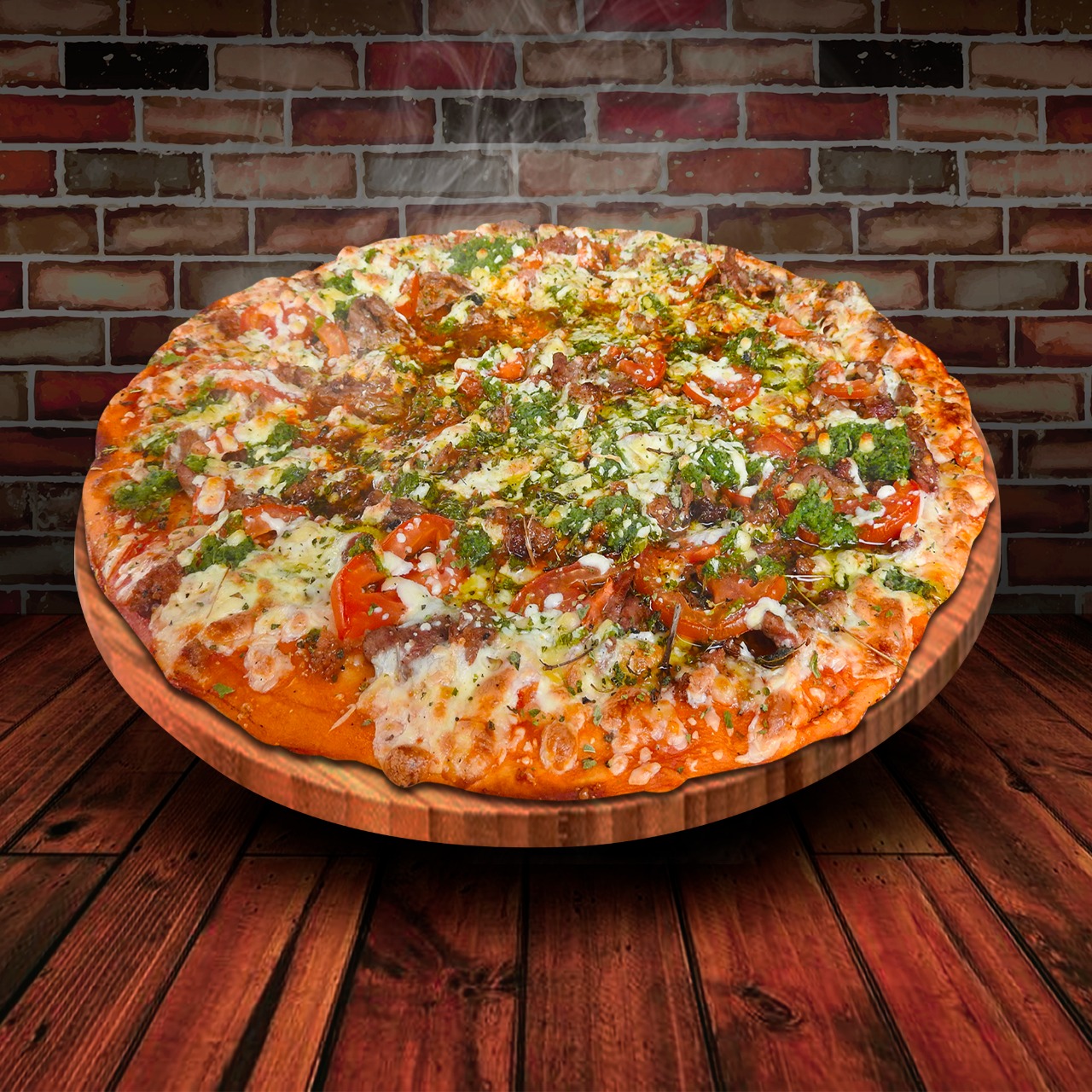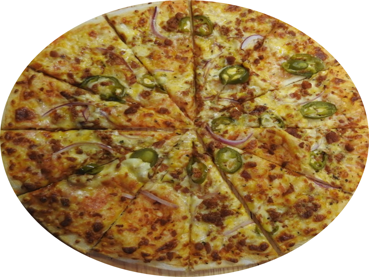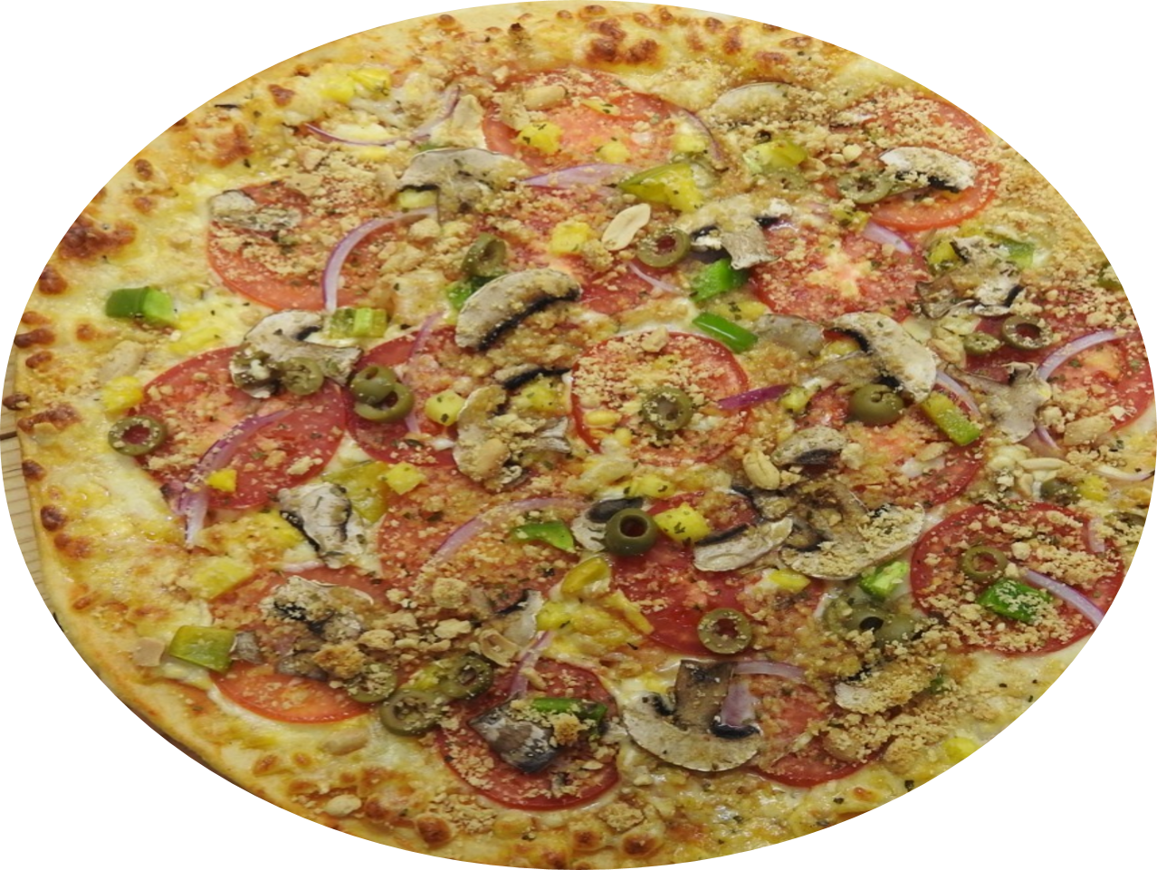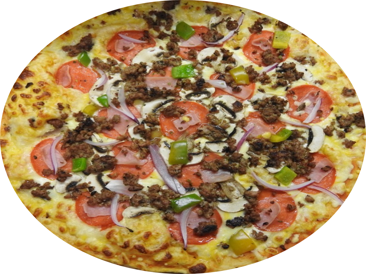 Queso mozzarella, queso Gouda, jamón, jitomate, cebolla morada, champiñones, pimiento verde, carne molida.