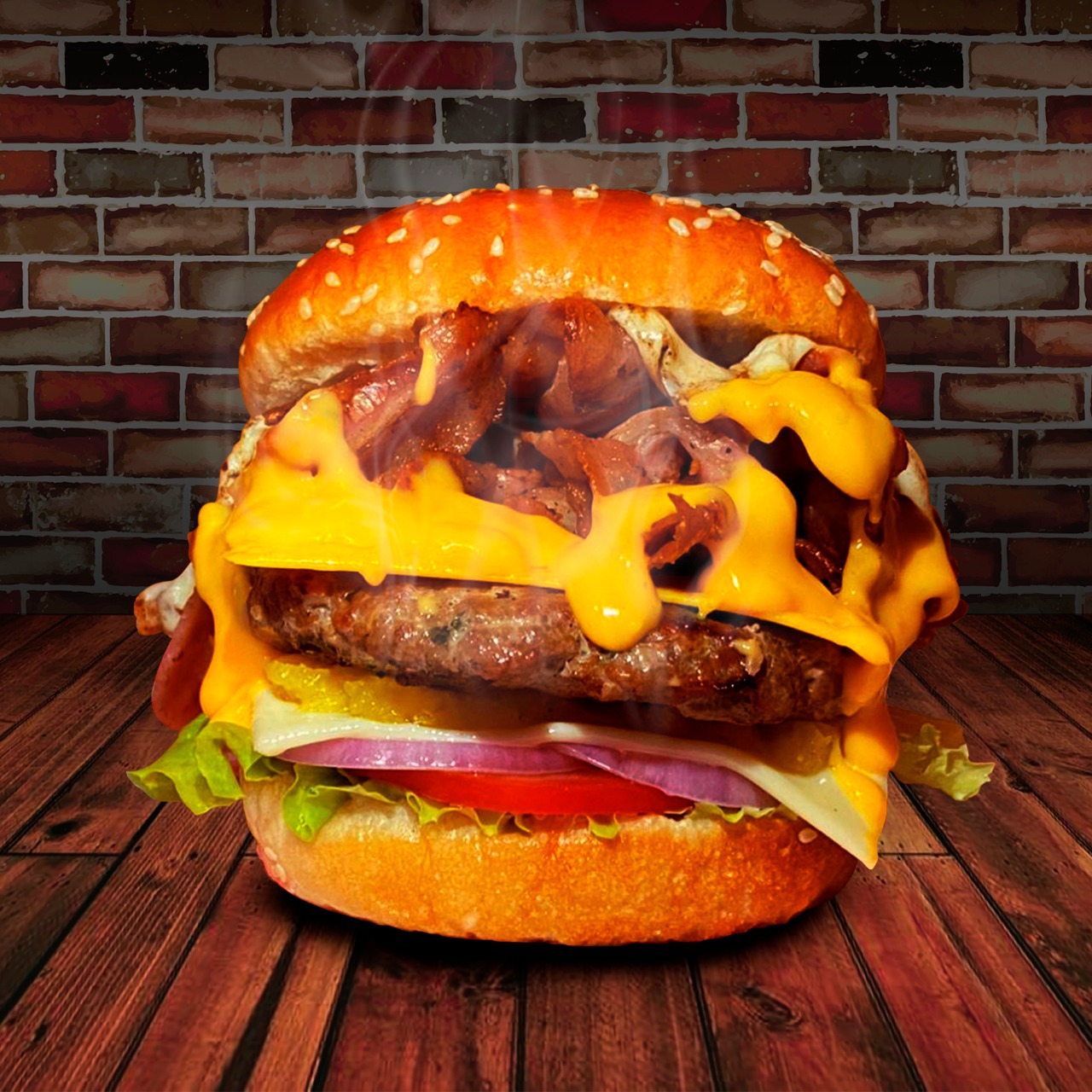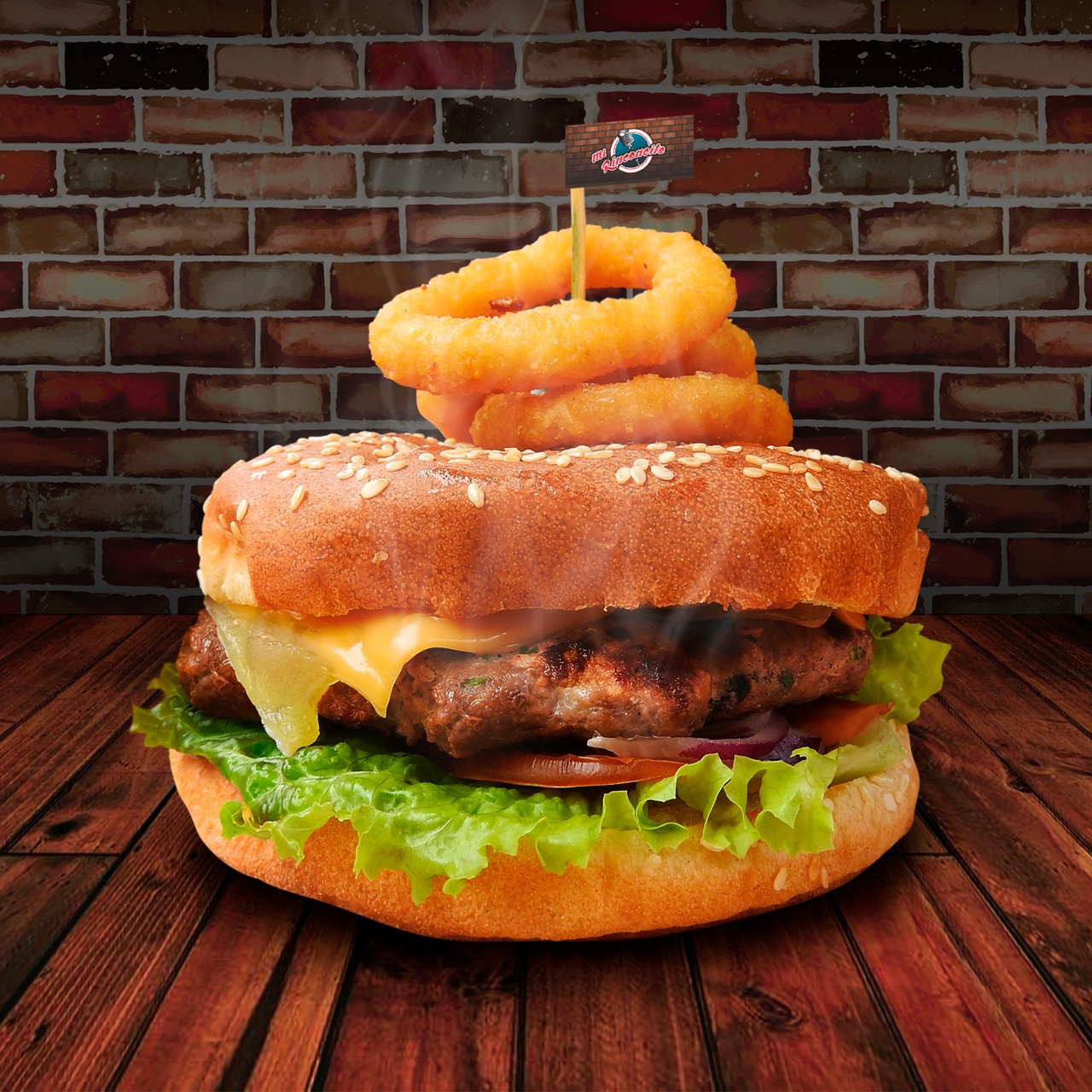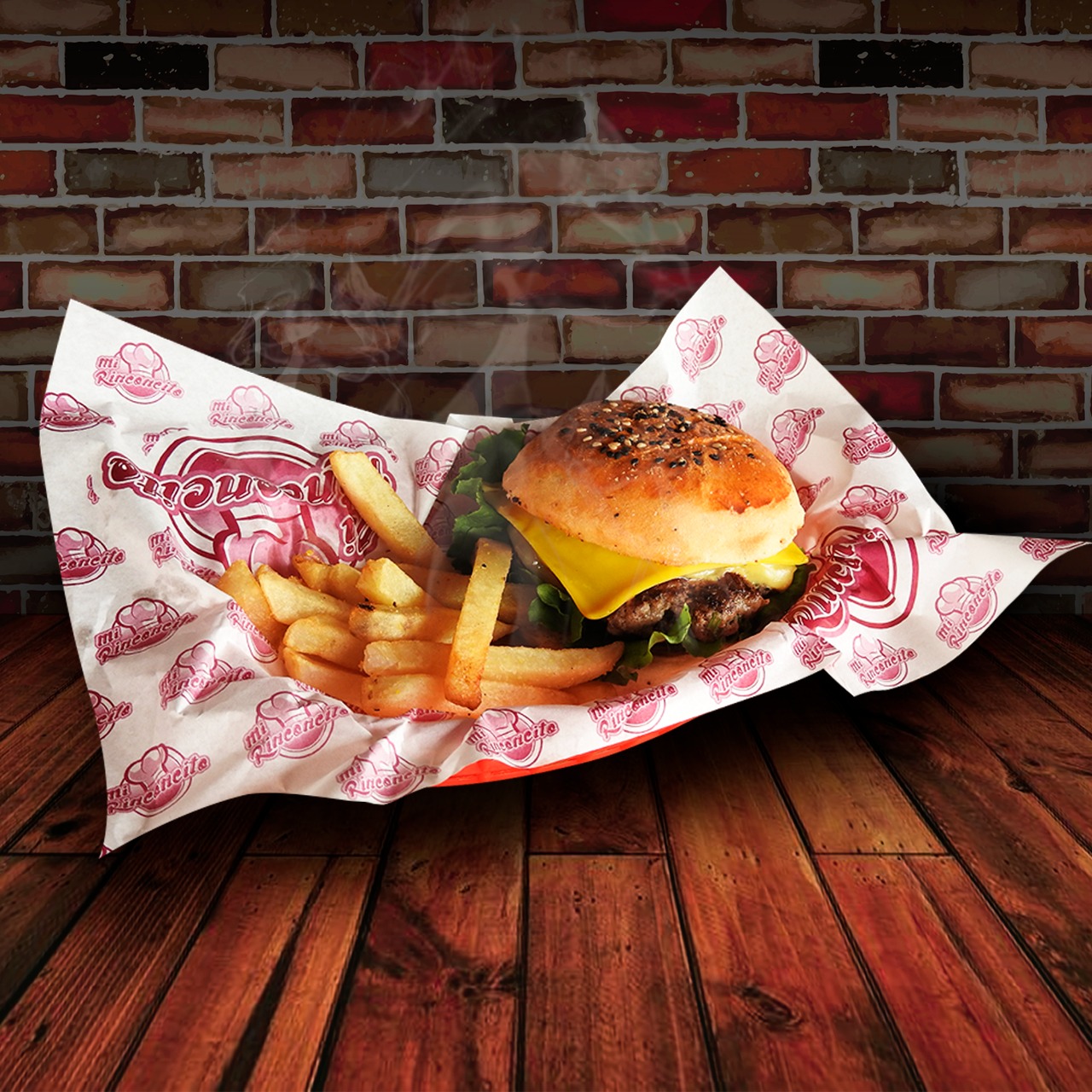 Nuestra deliciosa hamburguesa sencilla con 125 grs de carne + 1 porción de papas + 1 bebida