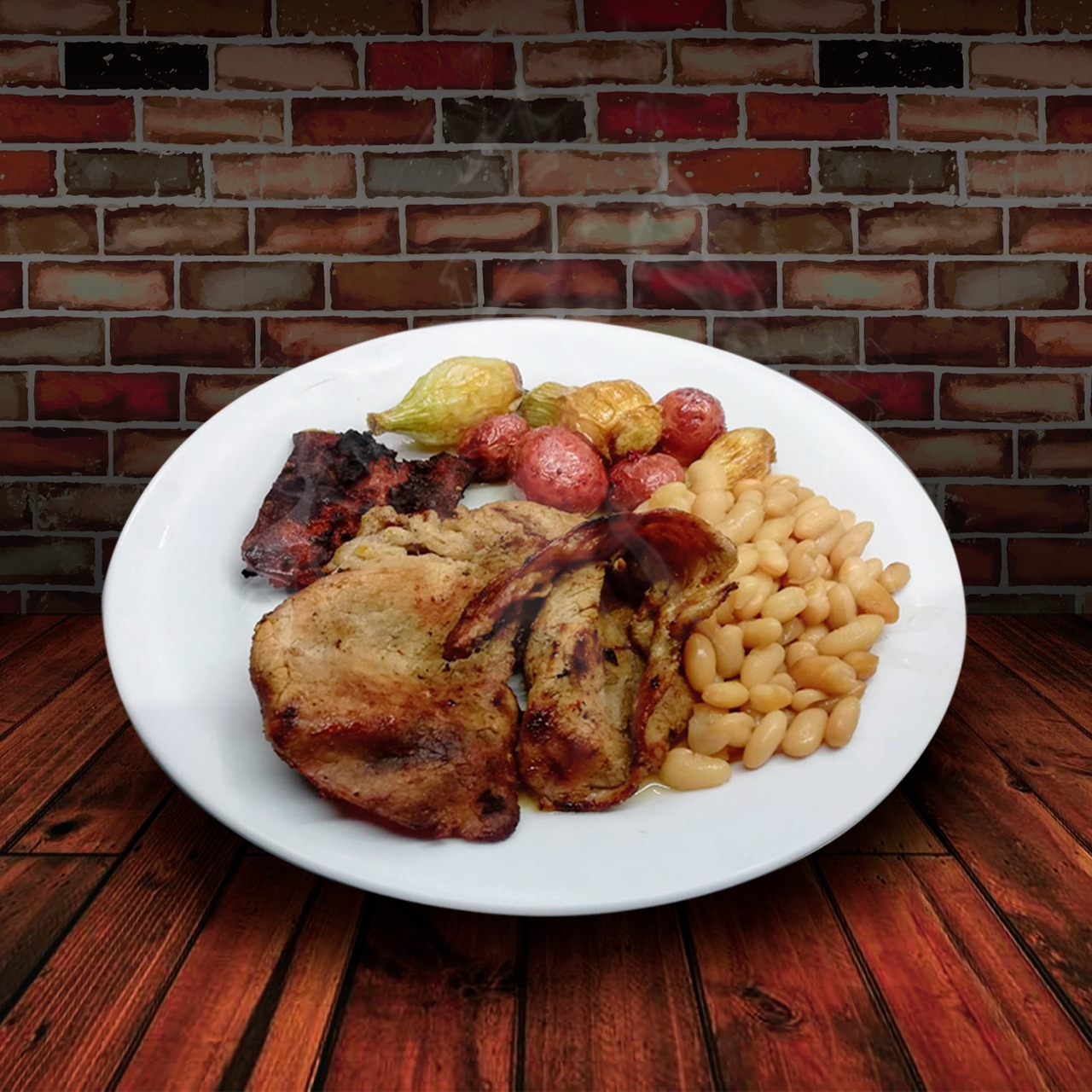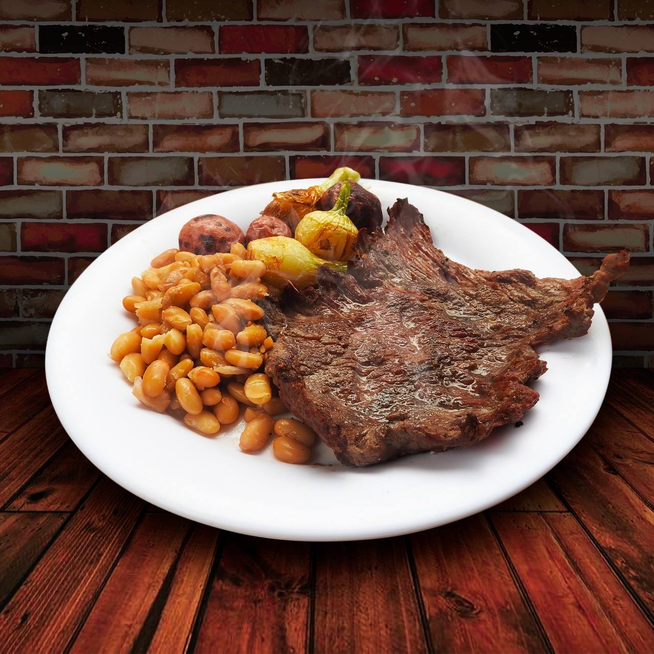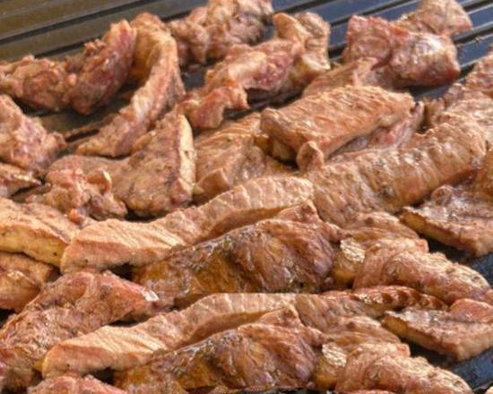 500 grs de carne asada, papas y cebolla cambray, frijol peruano, salsa y tortillas.