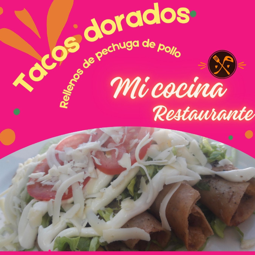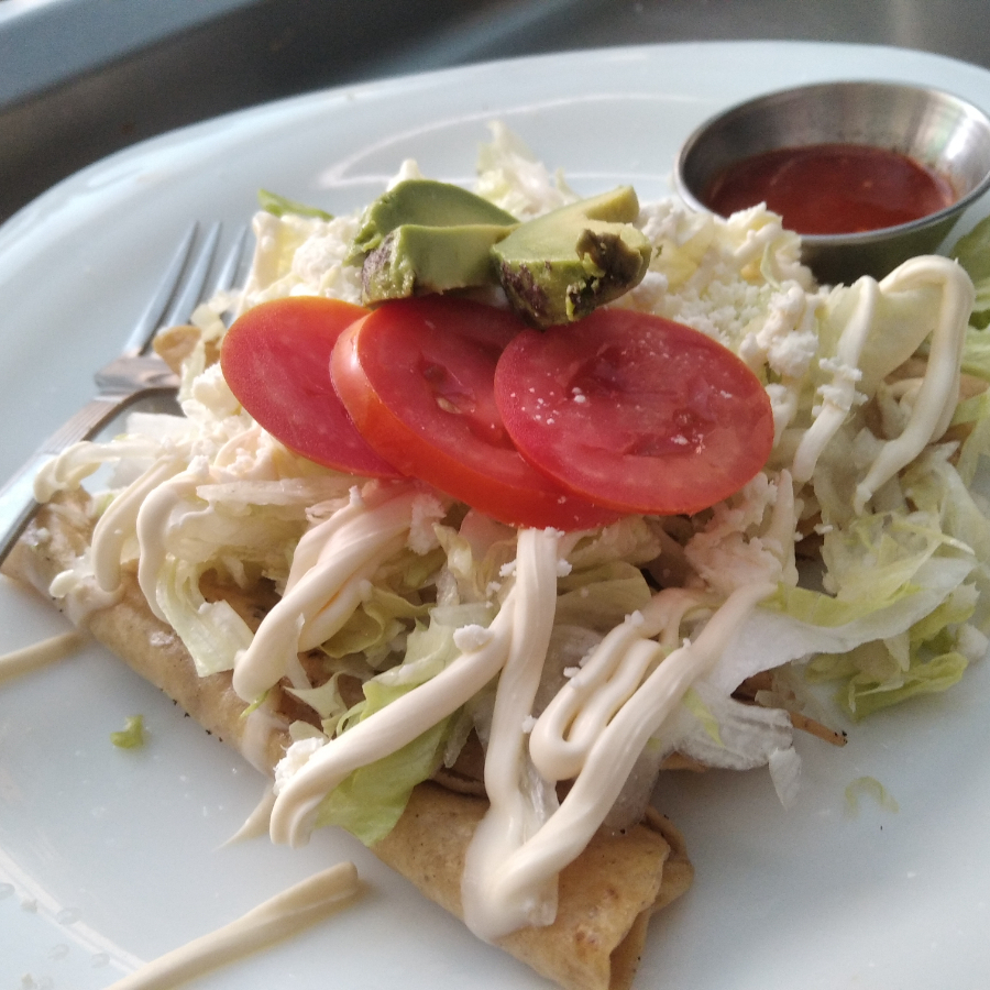Tacos de tortilla de maiz , rellena de pechuga de pollo , frita acompañados de ensalda de lechuga , jitomate y cebolla bañadas con queso y crema