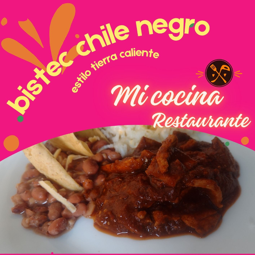 Carne asadita bañada con salsa de chile negro picosita, estilo tierra calleinte , acompañada de frijoles y arroz