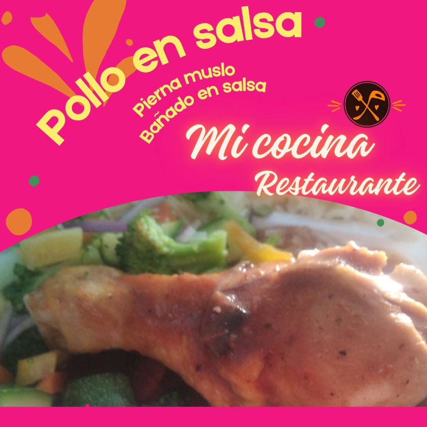 pierna o muslo en salsa acompañado de arroz y frijoles